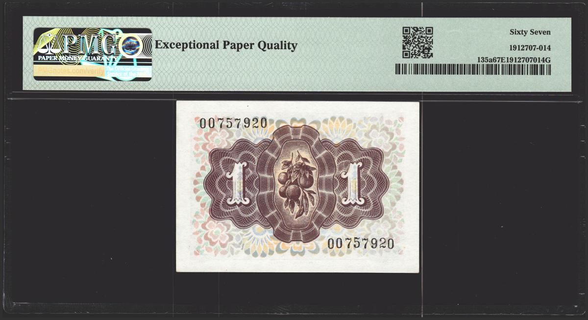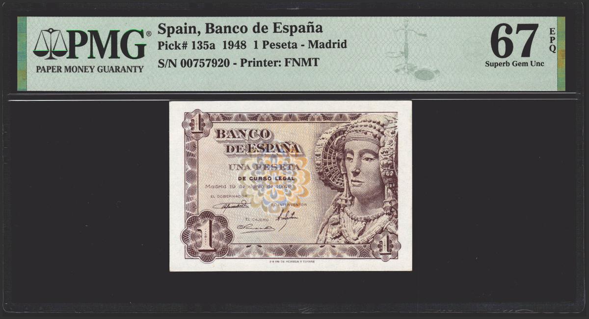 1 peseta. June 19, 1948. No series. (Edifil 2021: 457, Pick: 135a). Rare in this quality, original sizing. Uncirculated. PMG67EPQ package.