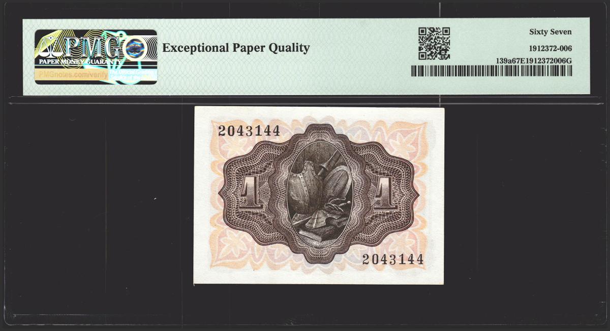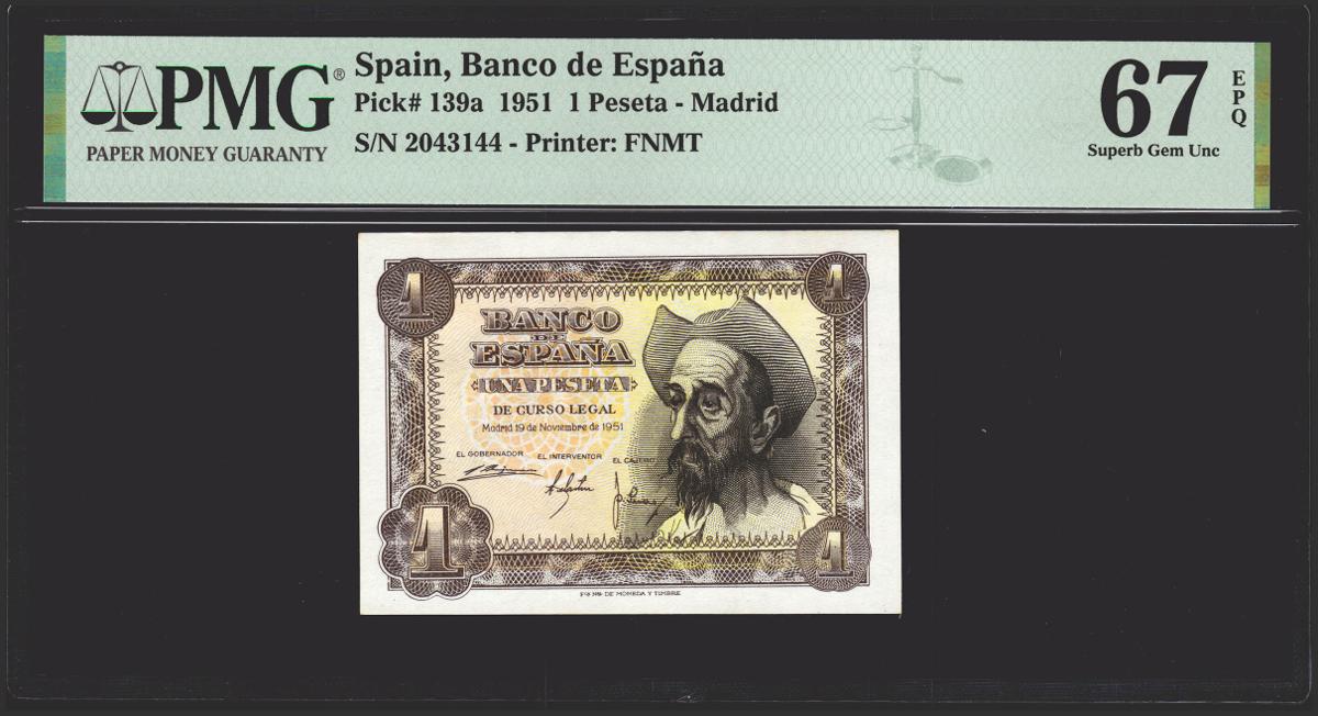 1 peseta. November 19, 1951. No series. (Edifil 2021: 461, Pick: 139a). Rare in this exceptional quality, original sizing. Uncirculated. PMG67EPQ package.