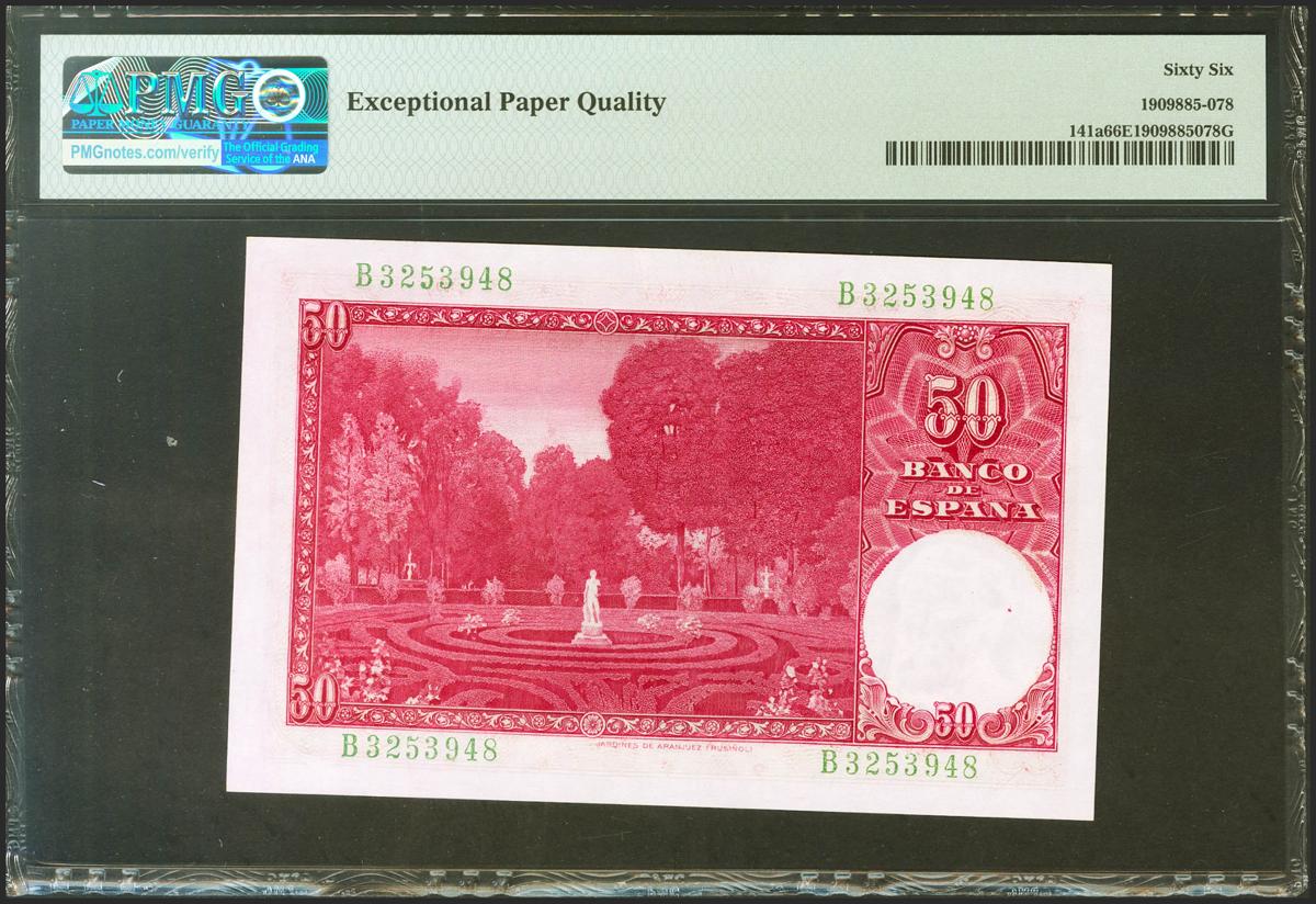50 pesetas. December 31, 1951. Series B. (Edifil 2021: 462a, Pick: 141a). Rare in this exceptional quality, original sizing. Uncirculated. PMG66EPQ package.