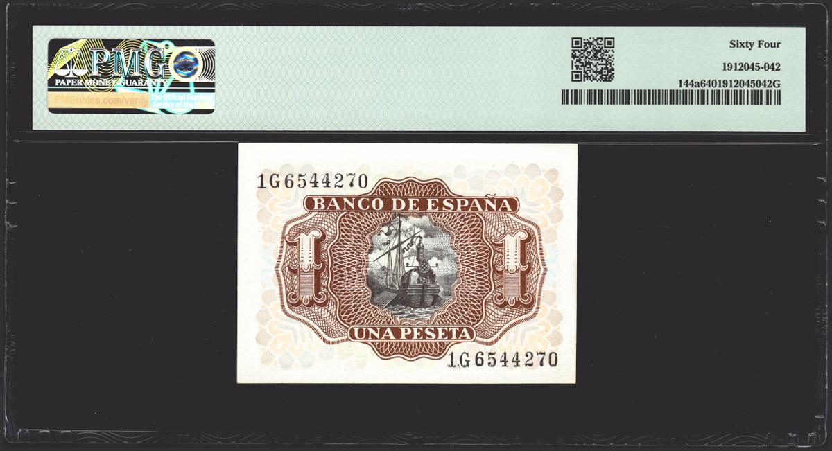 1 peseta. July 22, 1953. Series 1G. (Edifil 2021: 465a, Pick: 144a). Uncirculated. PMG64 encapsulation.