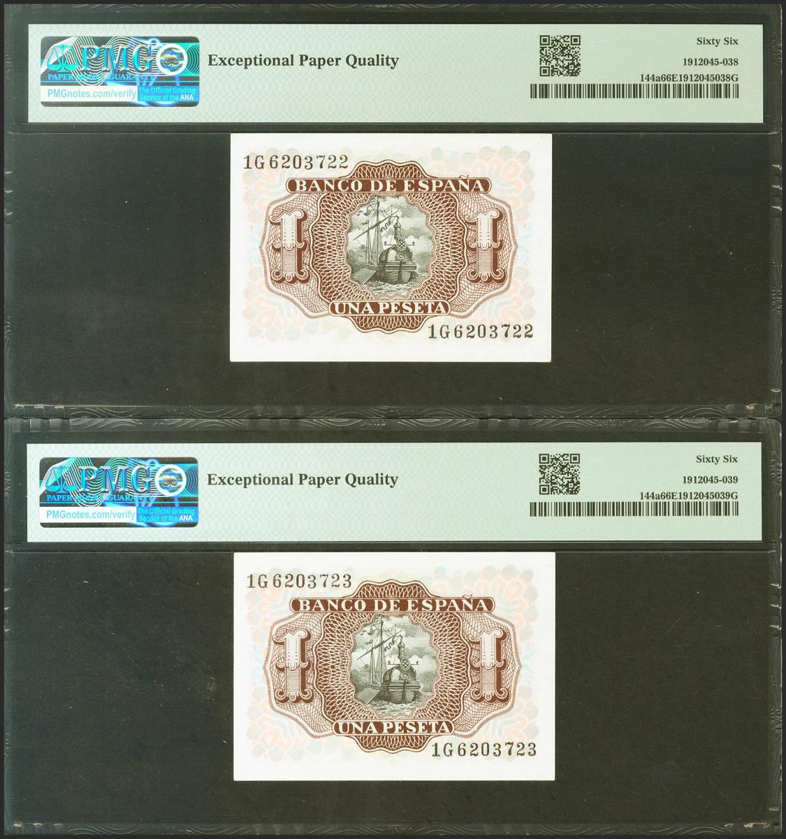 1 peseta. July 22, 1953. Correlative couple. 1G series. (Edifil 2021: 465a, Pick: 144a). Rare in this exceptional quality, original sizing. Uncirculated. PMG66EPQ package, both.