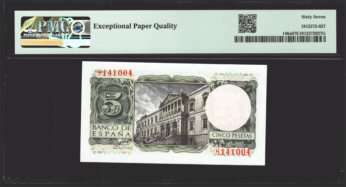 English 5 pesetas. July 22, 1954. No series. (Edifil 2021: 466, Pick: 146a). Rare in this exceptional quality, original sizing. Uncirculated. PMG67EPQ package.