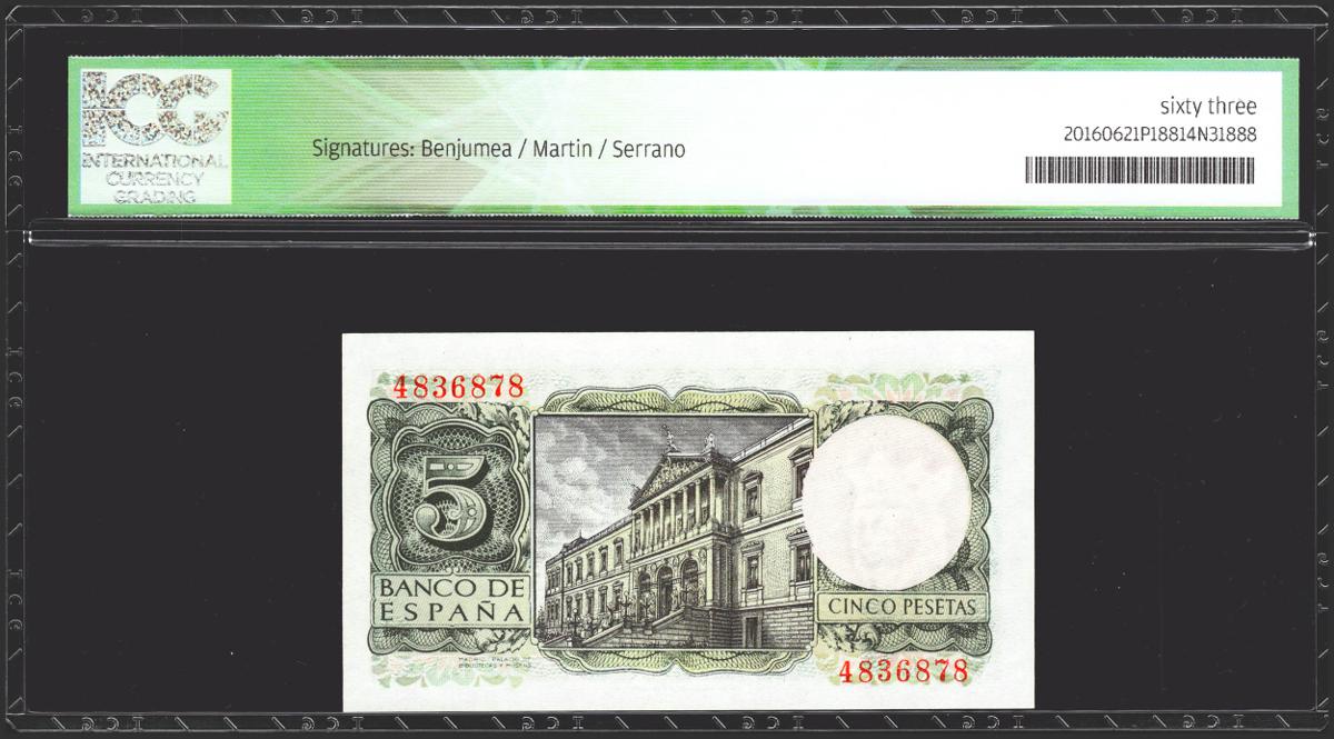 5 pesetas. July 22, 1954. No series. (Edifil 2021: 466, Pick: 146a). Uncirculated. ICG63 encapsulation.