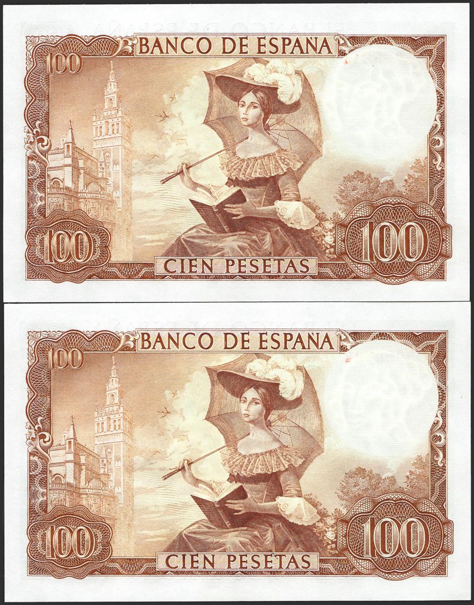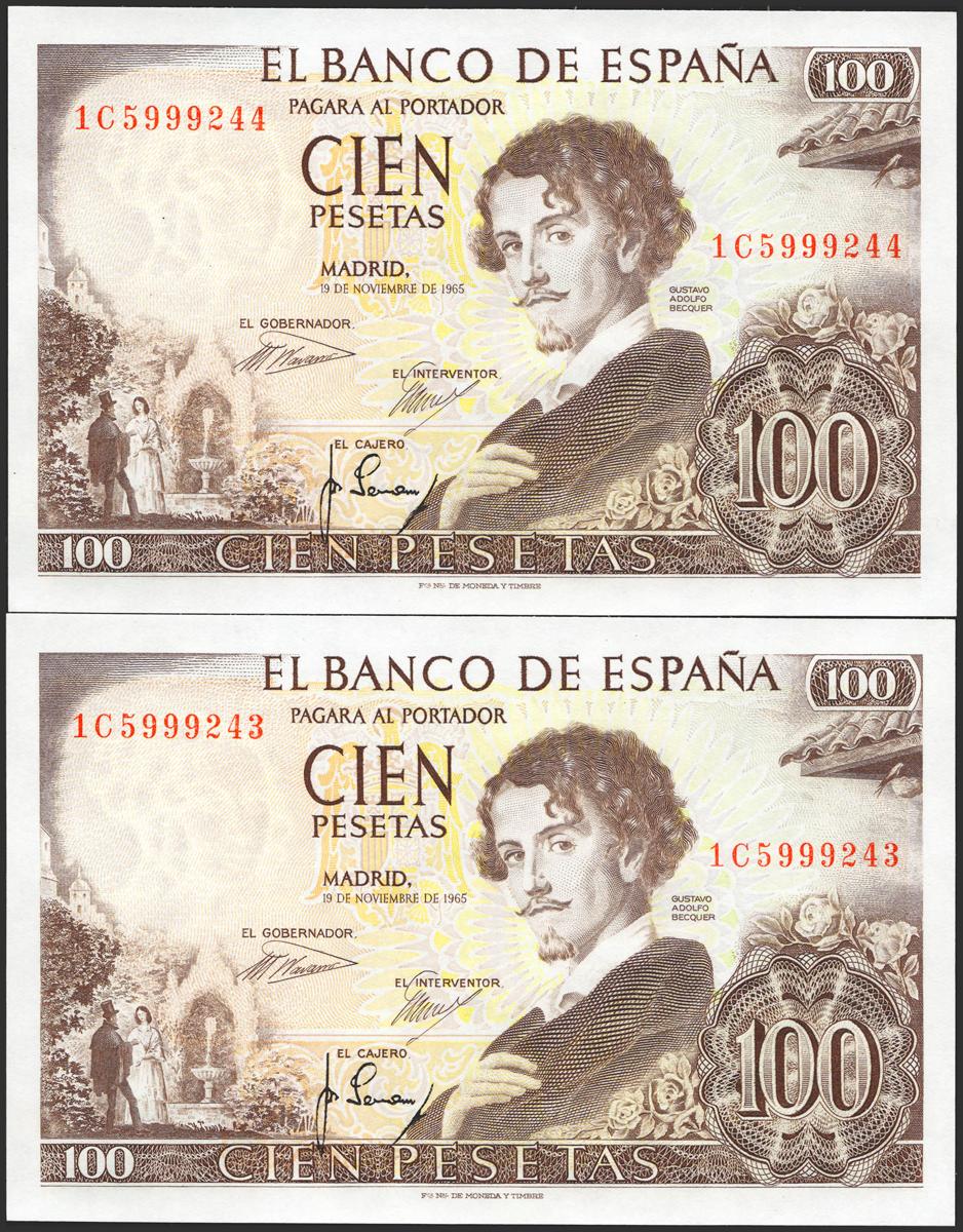 100 pesetas. November 19, 1965. Correlative couple. 1C series. (Edifil 2021: 470a). It retains all its original presto. Uncirculated.