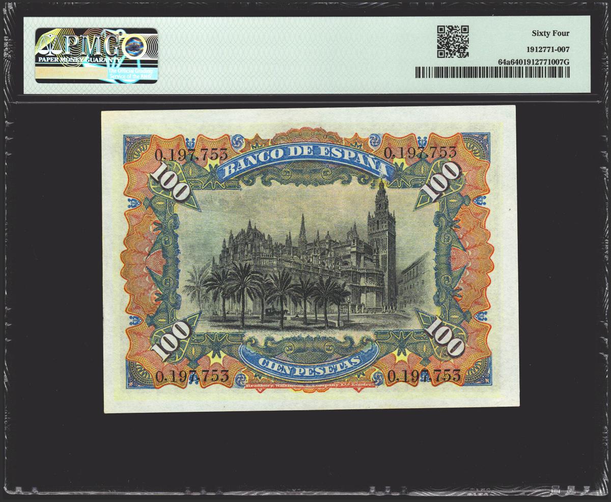 100 pesetas. July 15, 1907. No series. (Edifil 2021: 320, Pick: 64a). Rare, especially in this quality. Uncirculated. PMG64 encapsulation.