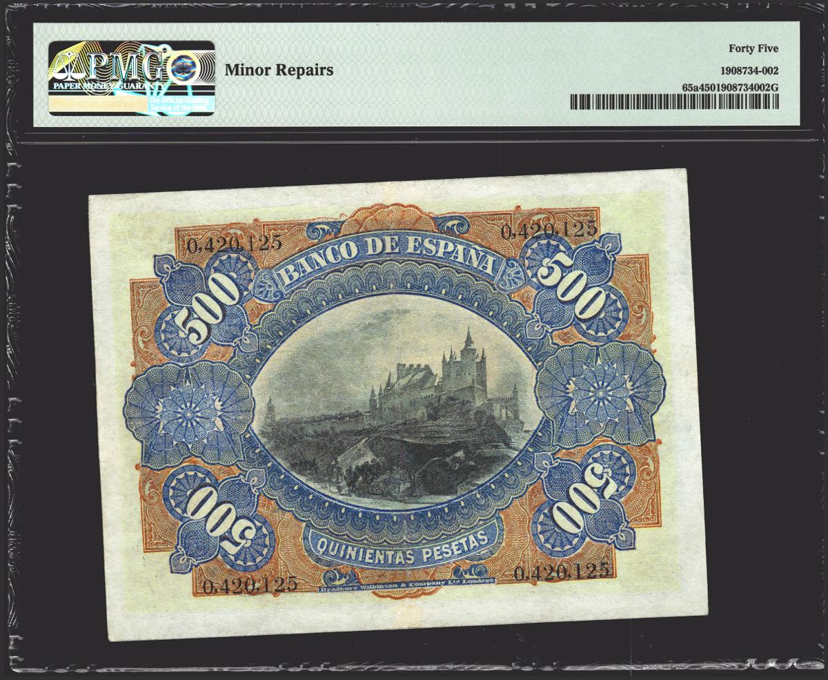 500 pesetas. July 15, 1907. No series. (Edifil 2021: 321, Pick: 65a). Rare and minimally repaired. Almost Extremely Fine. PMG45 package (minor repairs).