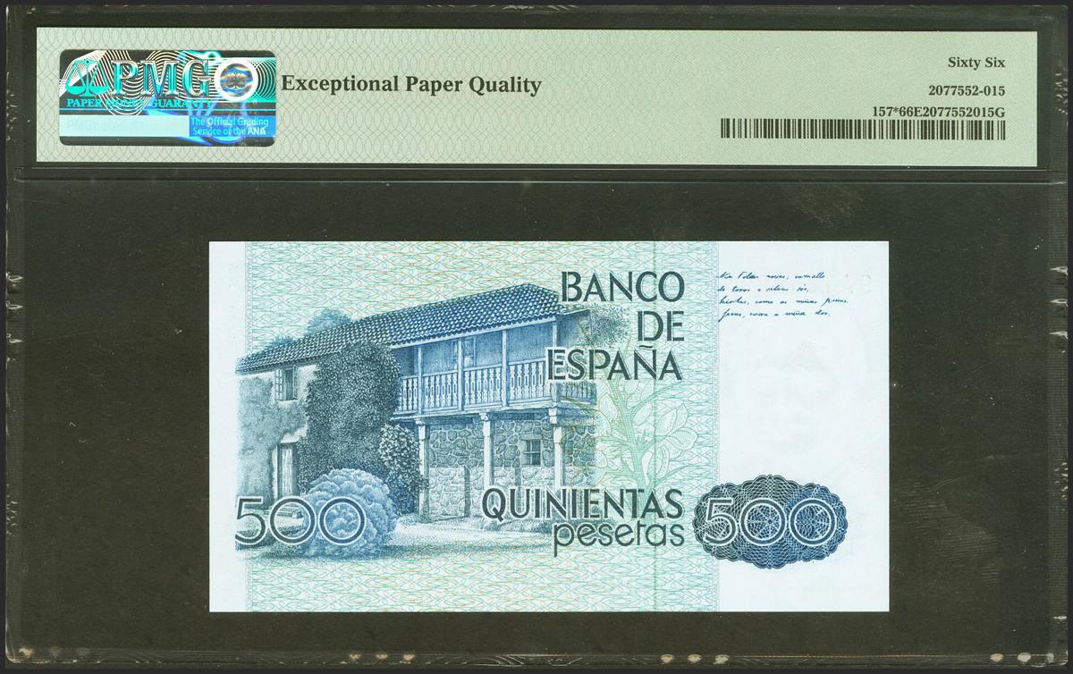 500 pesetas. October 23, 1979. Special series 9A. (Edifil 2021: 476b, Pick: 157*). Rare in this exceptional quality. Uncirculated. PMG66EPQ package.