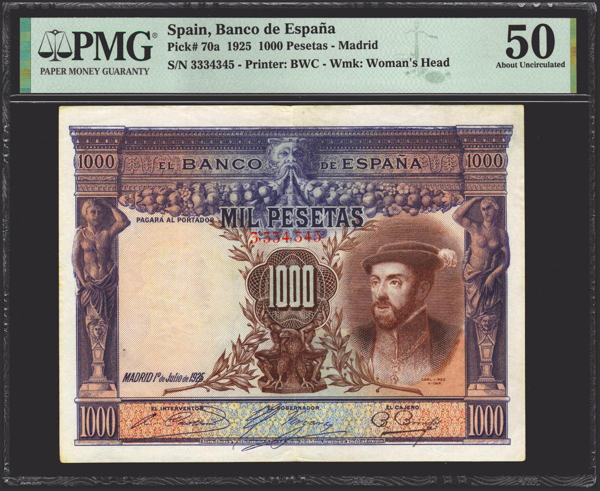 1000 pesetas. July 1, 1925. Without series and numbering prior to 3646000 (this numbering is rarer, especially in these qualities). (Edifil 2021: 324, Pick: 70c). Very rare in this quality. Extremely Fine. PMG50 package.