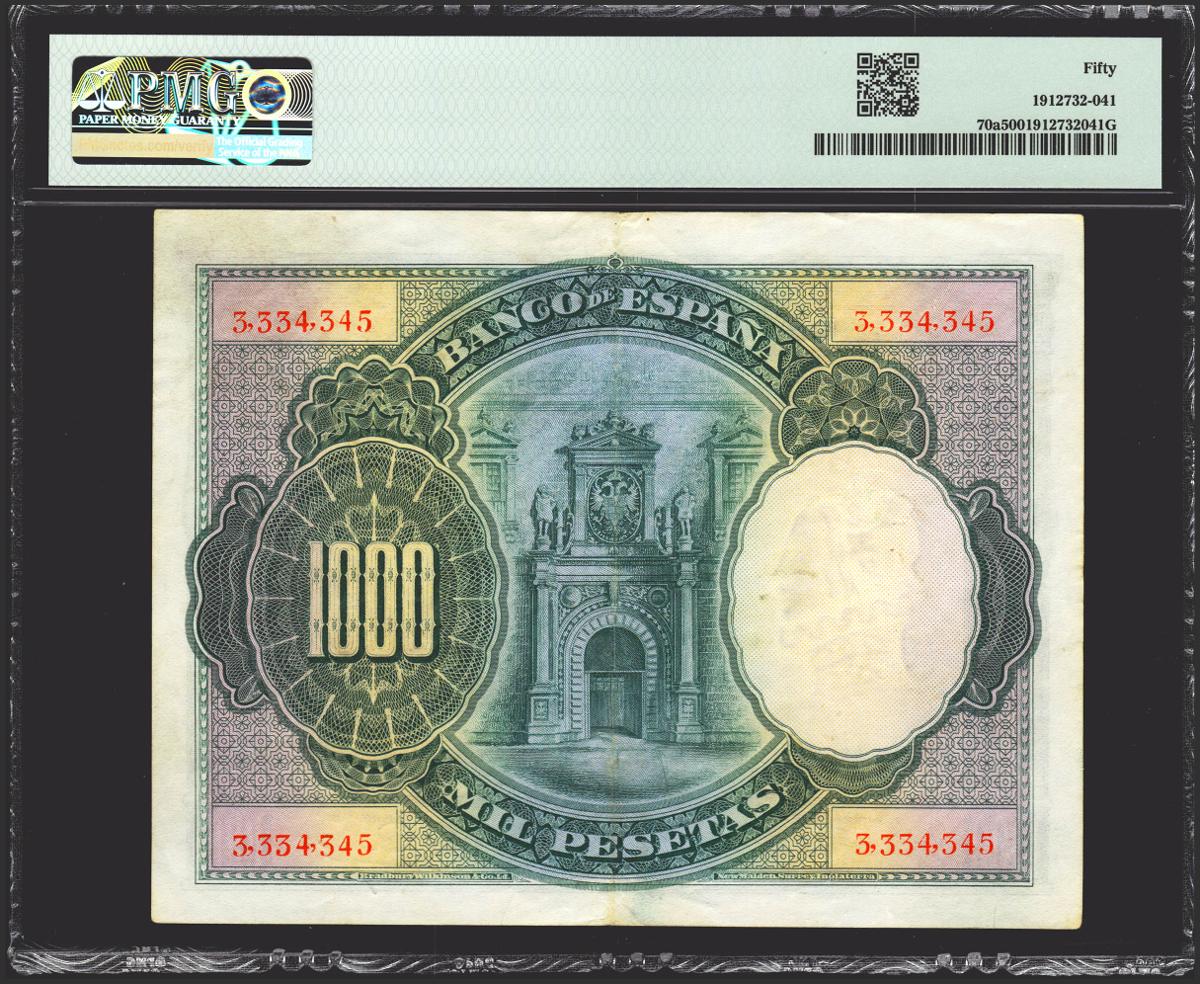 1000 pesetas. July 1, 1925. Without series and numbering prior to 3646000 (this numbering is rarer, especially in these qualities). (Edifil 2021: 324, Pick: 70c). Very rare in this quality. Extremely Fine. PMG50 package.