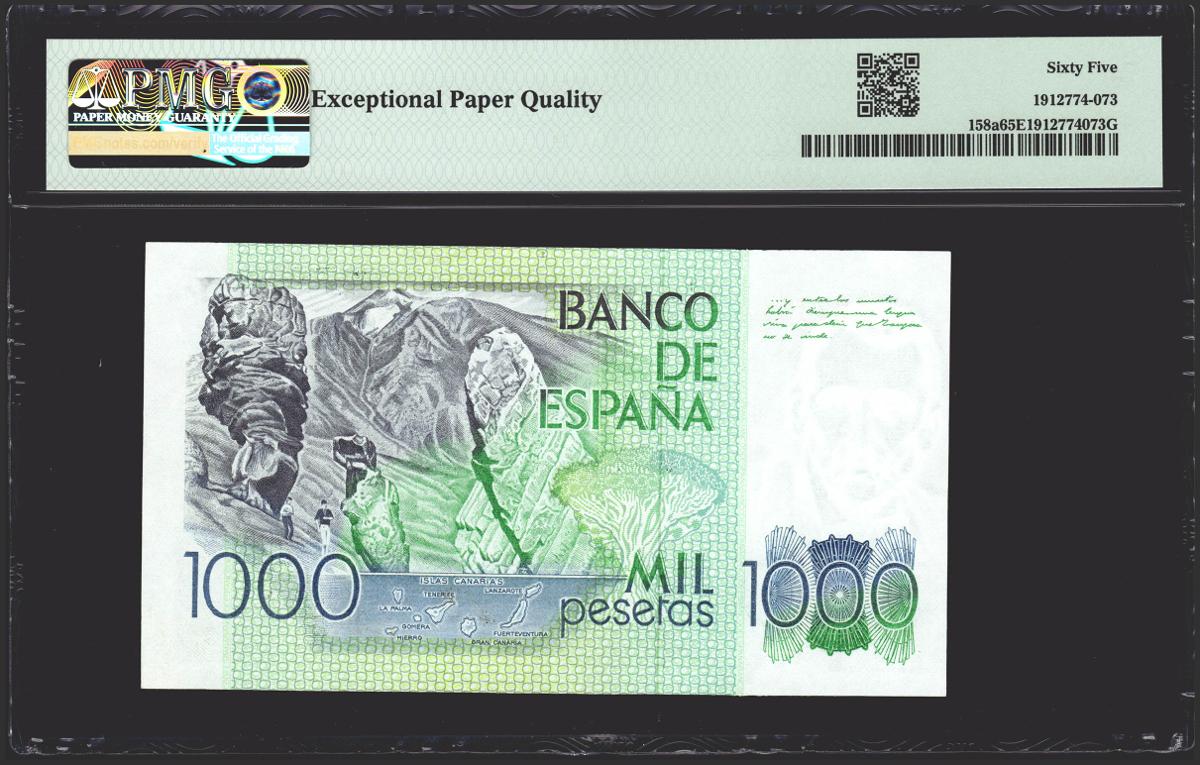 1000 pesetas. October 23, 1979. Without series. (Edifil 2021: 477, Pick: 158a). Rare in this exceptional quality. Uncirculated. PMG65EPQ package.