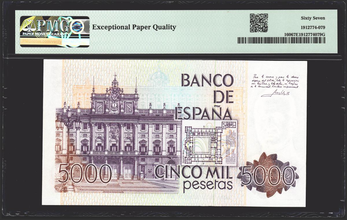 5000 pesetas. October 23, 1979. Without series. (Edifil 2021: 478, Pick: 160). Rare in this exceptional quality, original sizing. Uncirculated. PMG67EPQ package.