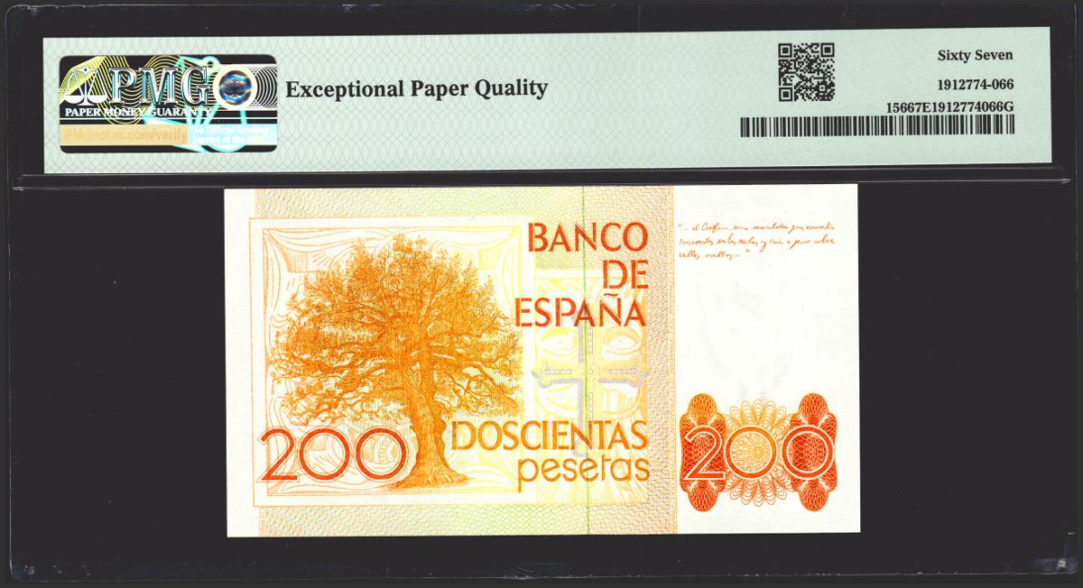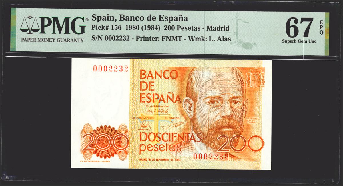 200 pesetas. September 16, 1980. Without series and very low numbering. (Edifil 2021: 480, Pick: 156). Rare in this exceptional quality. Uncirculated. PMG67EPQ package.