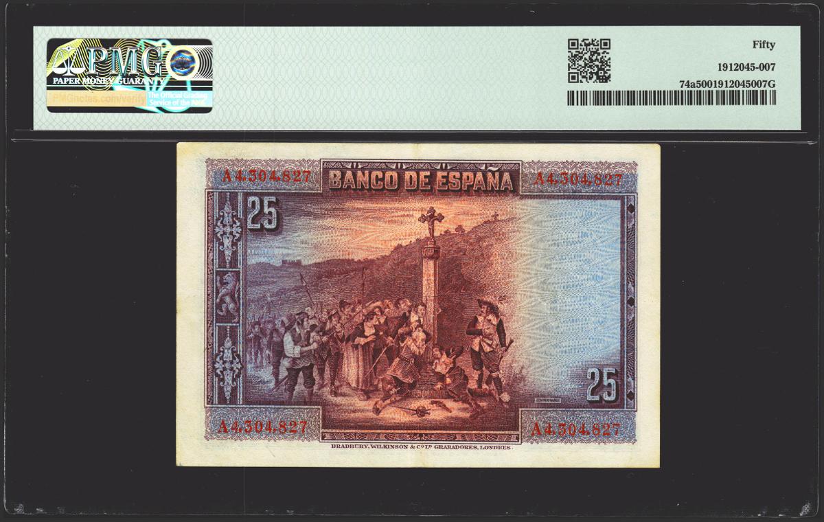 25 pesetas. August 15, 1928. Series A and numbering prior to 7,780,000. (Edifil 2021: 328a, Pick: 74a). Extremely Fine. PMG50 package.