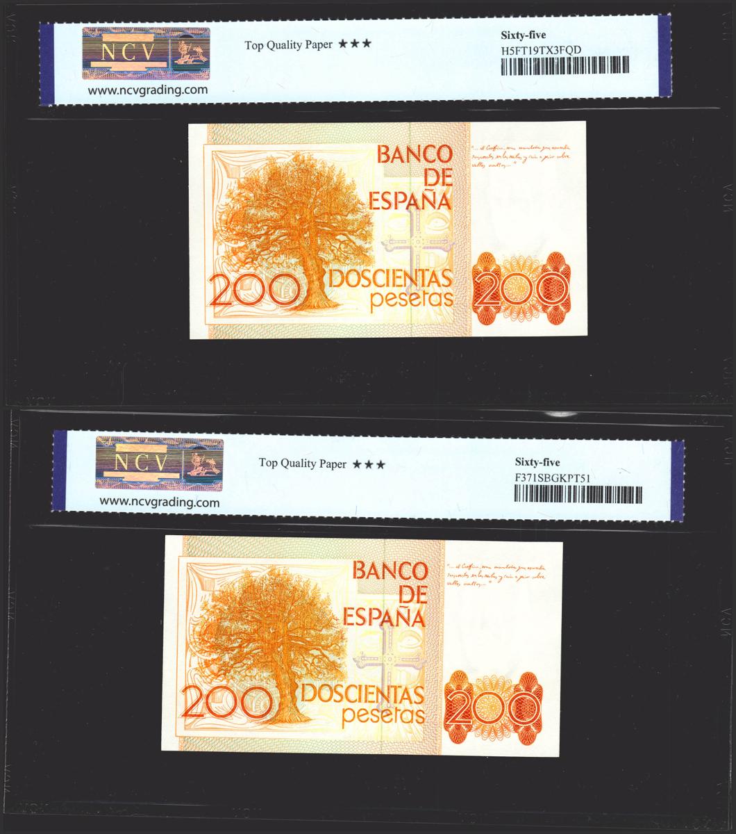 200 pesetas. September 16, 1980. Correlative couple. Series L. (Edifil 2021: 480a, Pick: 156). original sizing Uncirculated. NCV65TQP packages, both.