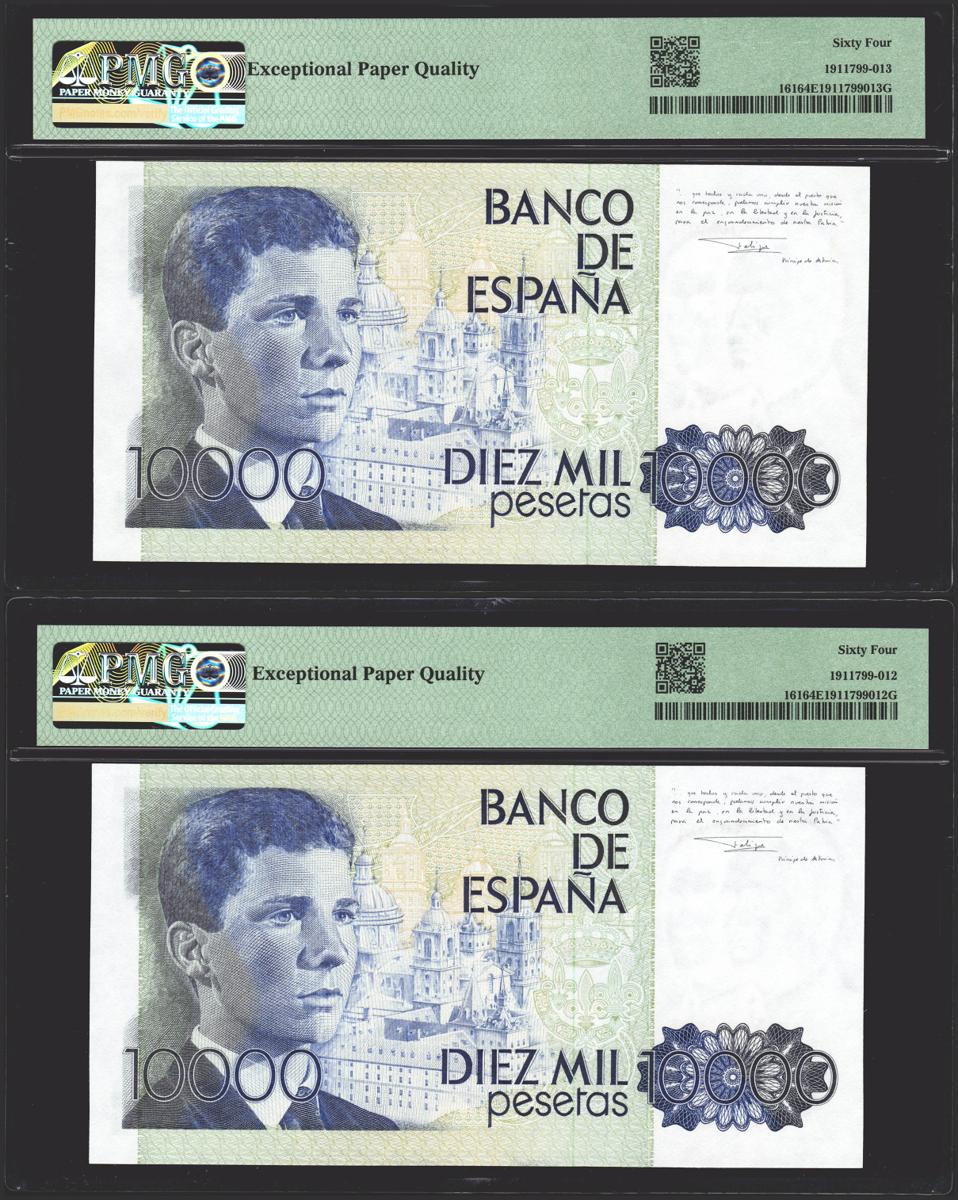 10,000 pesetas. October 24, 1985. Correlative couple. 1X series. (Edifil 2021: 481a, Pick: 161). original sizing PMG64EPQ packages, both.