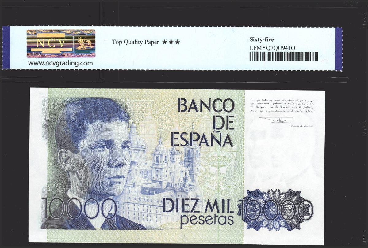 10,000 pesetas. September 24, 1985. Series 1X. (Edifil 2021: 481a, Pick: 161). Uncirculated. NCV65TQP package.