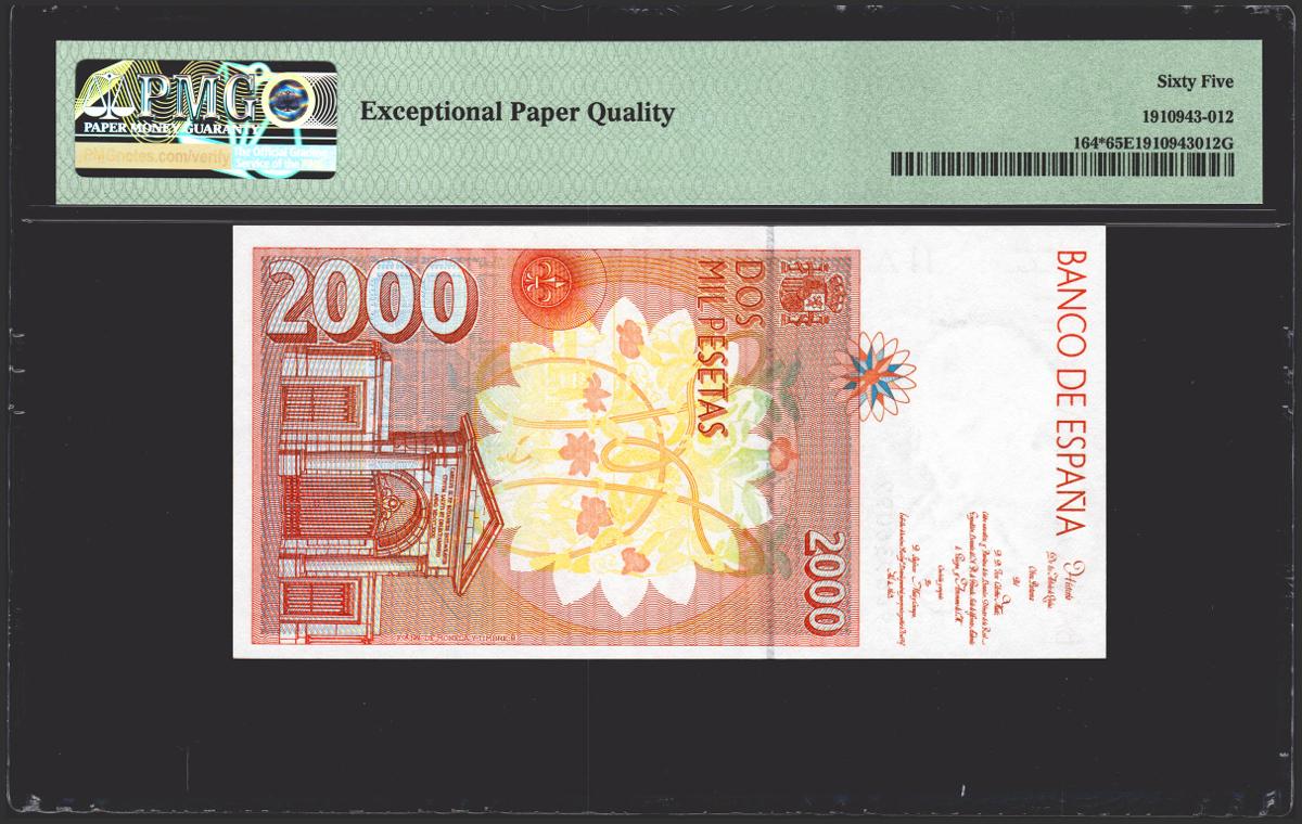 2000 pesetas. April 24, 1992. Special series 9D. (Edifil 2021: 482Ab, Pick: 164*). Rare in this quality, original sizing. Uncirculated. PMG65EPQ package.