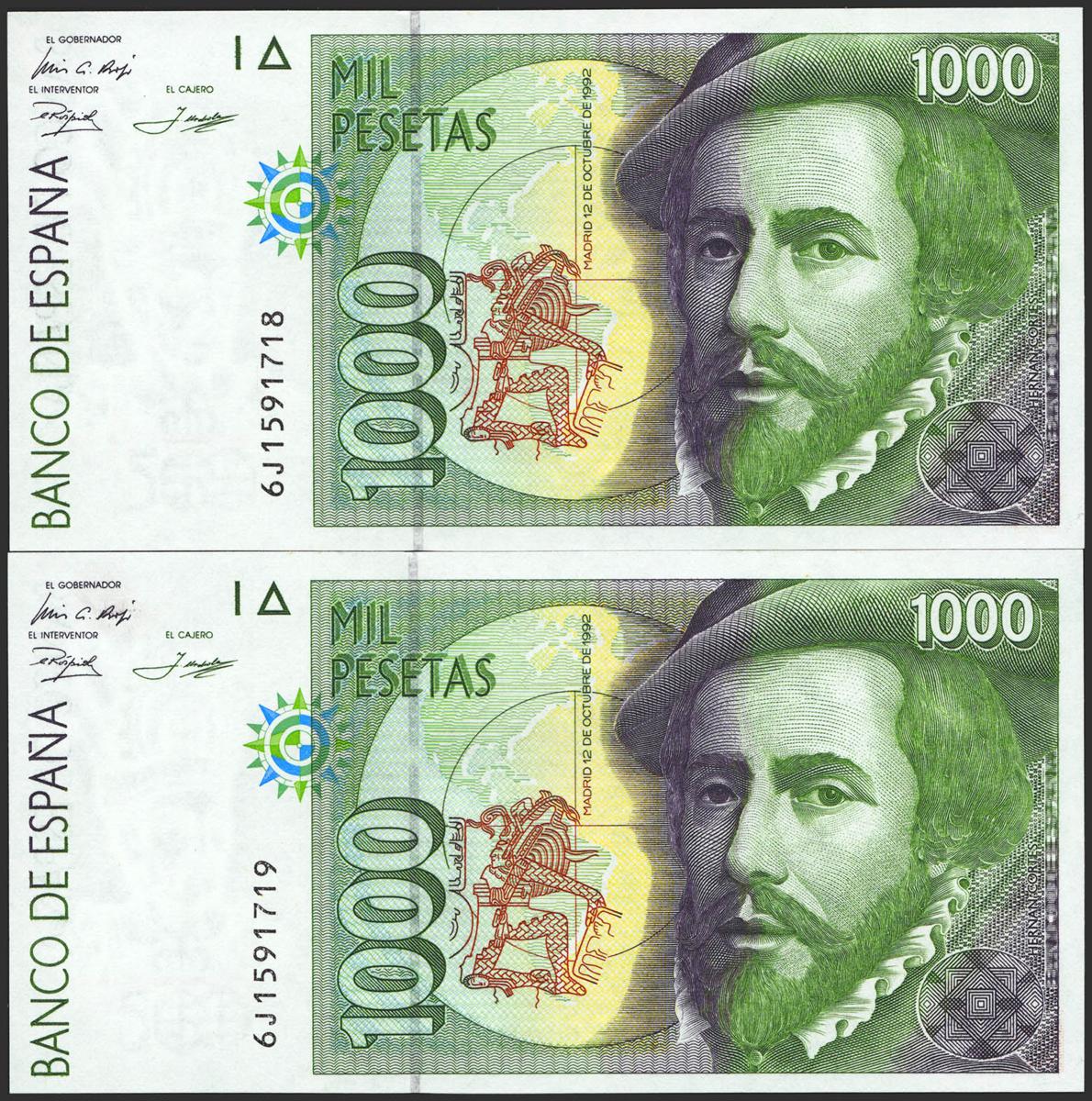 1000 pesetas. October 12, 1992. Correlative couple. 6J series. (Edifil 2021: 483b). Uncirculated.