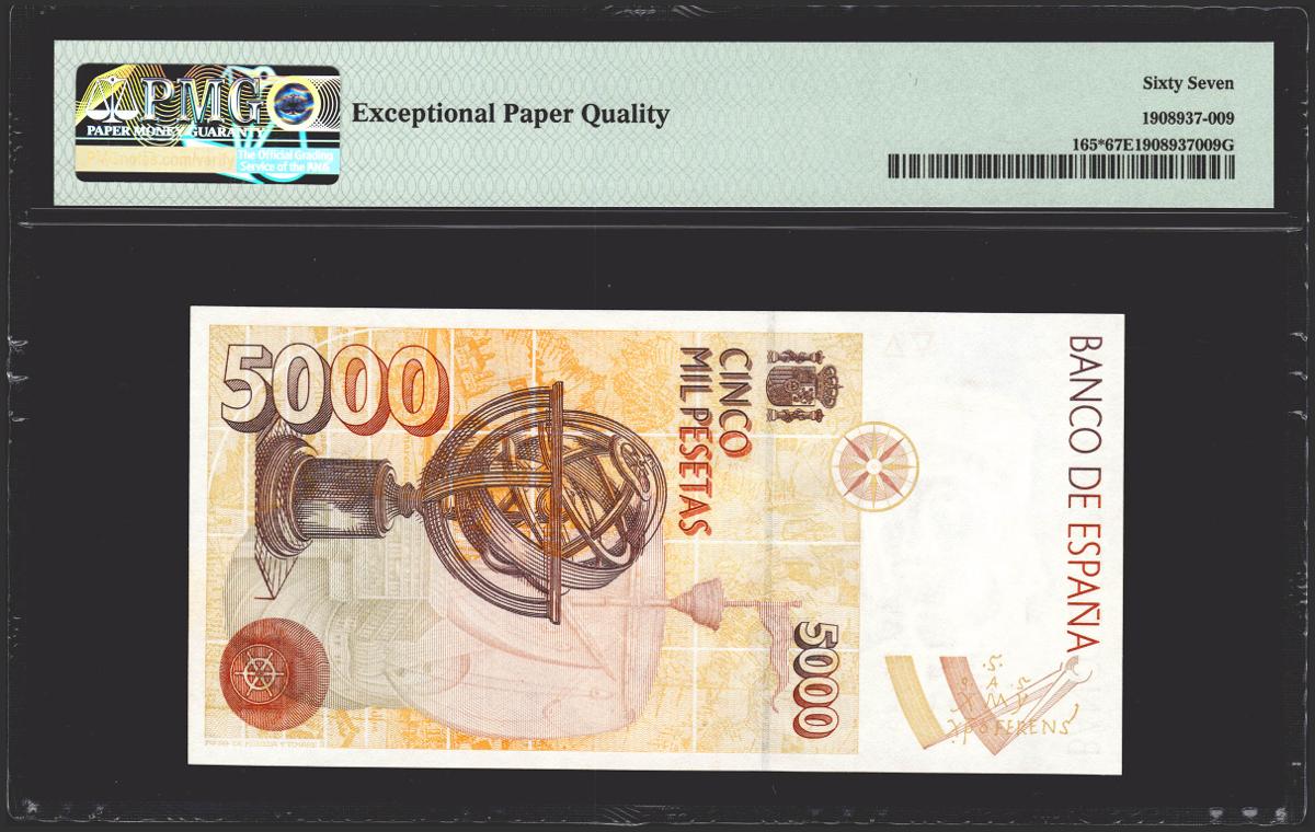 5000 pesetas. October 12, 1992. Special series 9A. (Edifil 2021: 484b, Pick: 165*). Rare in this exceptional quality. Uncirculated. PMG67EPQ package.