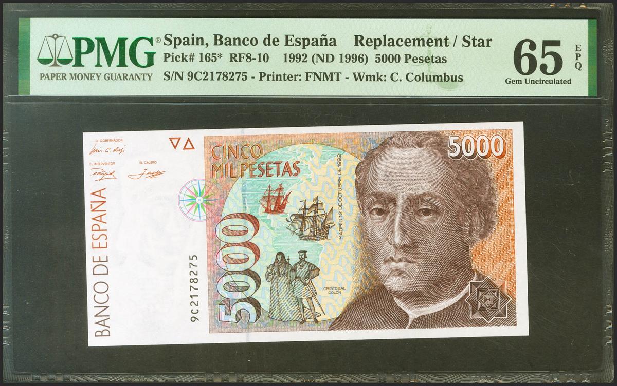 5000 pesetas. October 12, 1992. Special series 9C. (Edifil 2021: 484b, Pick: 165*). Rare in this exceptional quality. Uncirculated. PMG65EPQ package.