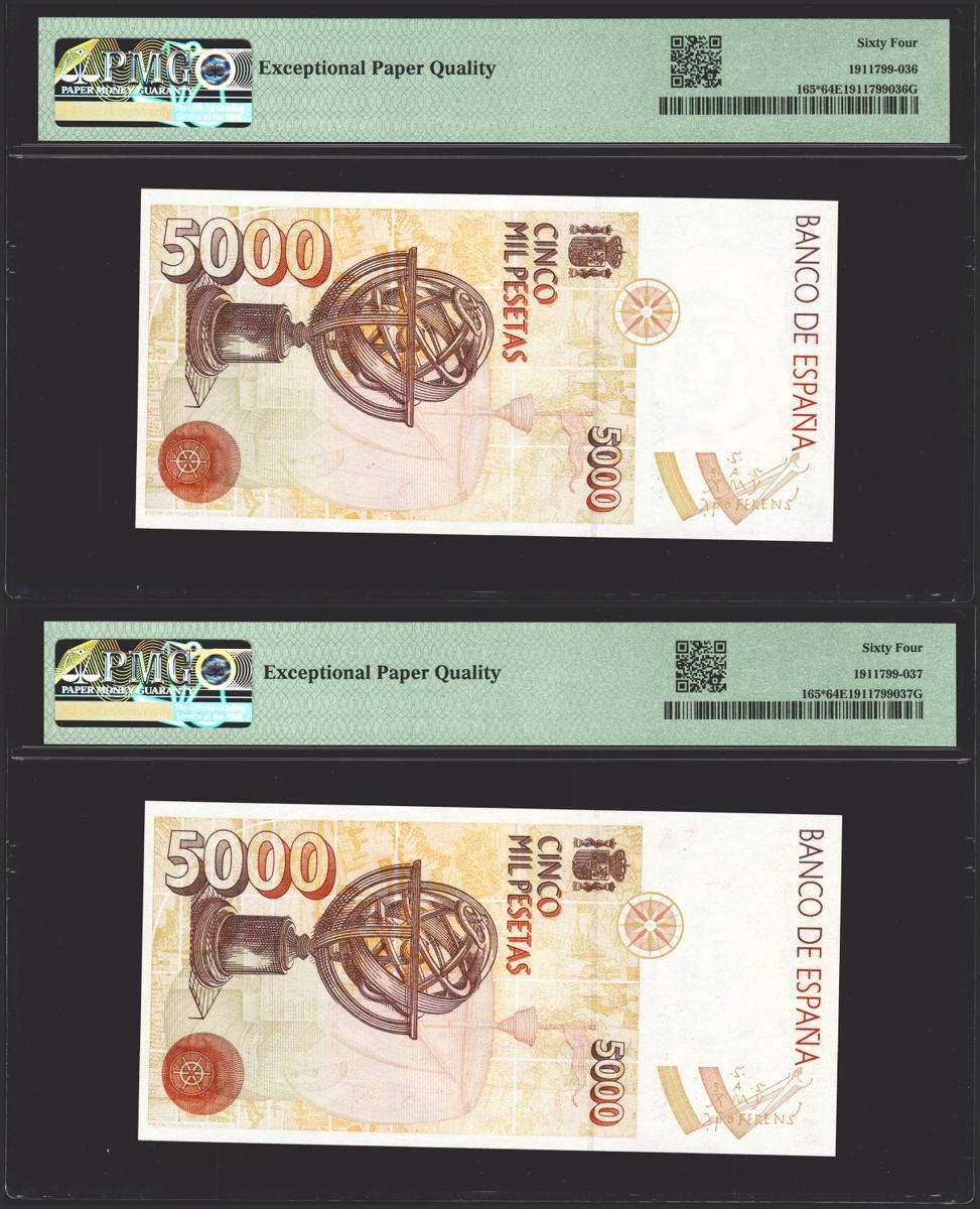 5000 pesetas. October 12, 1992. Correlative couple. Special series 9C. (Edifil 2021: 484b, Pick: 165*). Uncirculated. PMG64EPQ packages, both.