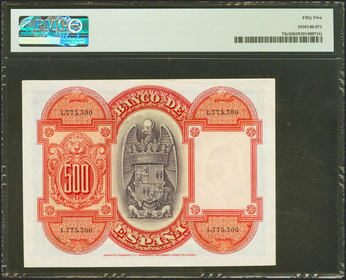 500 pesetas. July 24, 1927. Without series and subsequent numbering 1602000. (Edifil 2021: 352, Pick: 73c). Rare in this quality. Good Extremely Fine. PMG55 package.