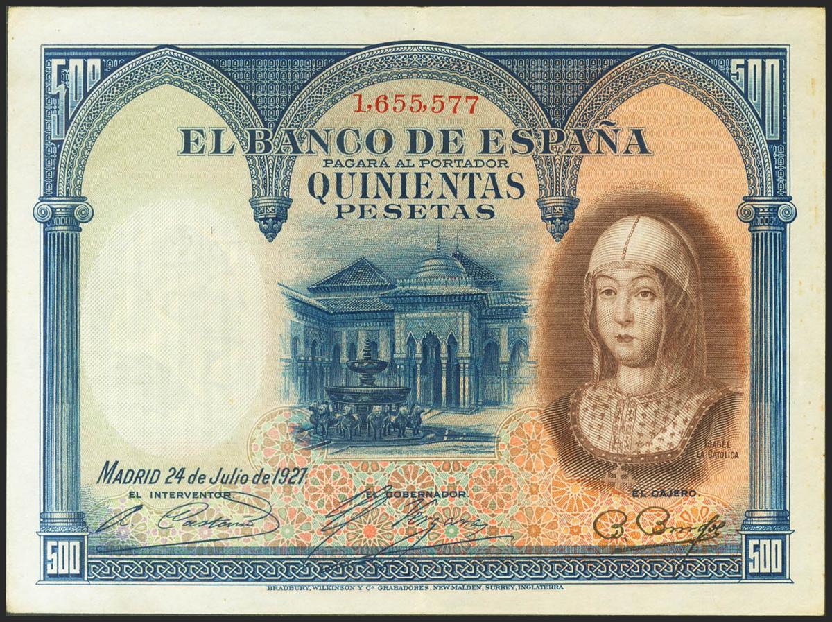 English 500 pesetas. July 24, 1927. Without series and numbering after 1602000. (Edifil 2021: 352). It retains part of the original sizing. Extremely Fine.