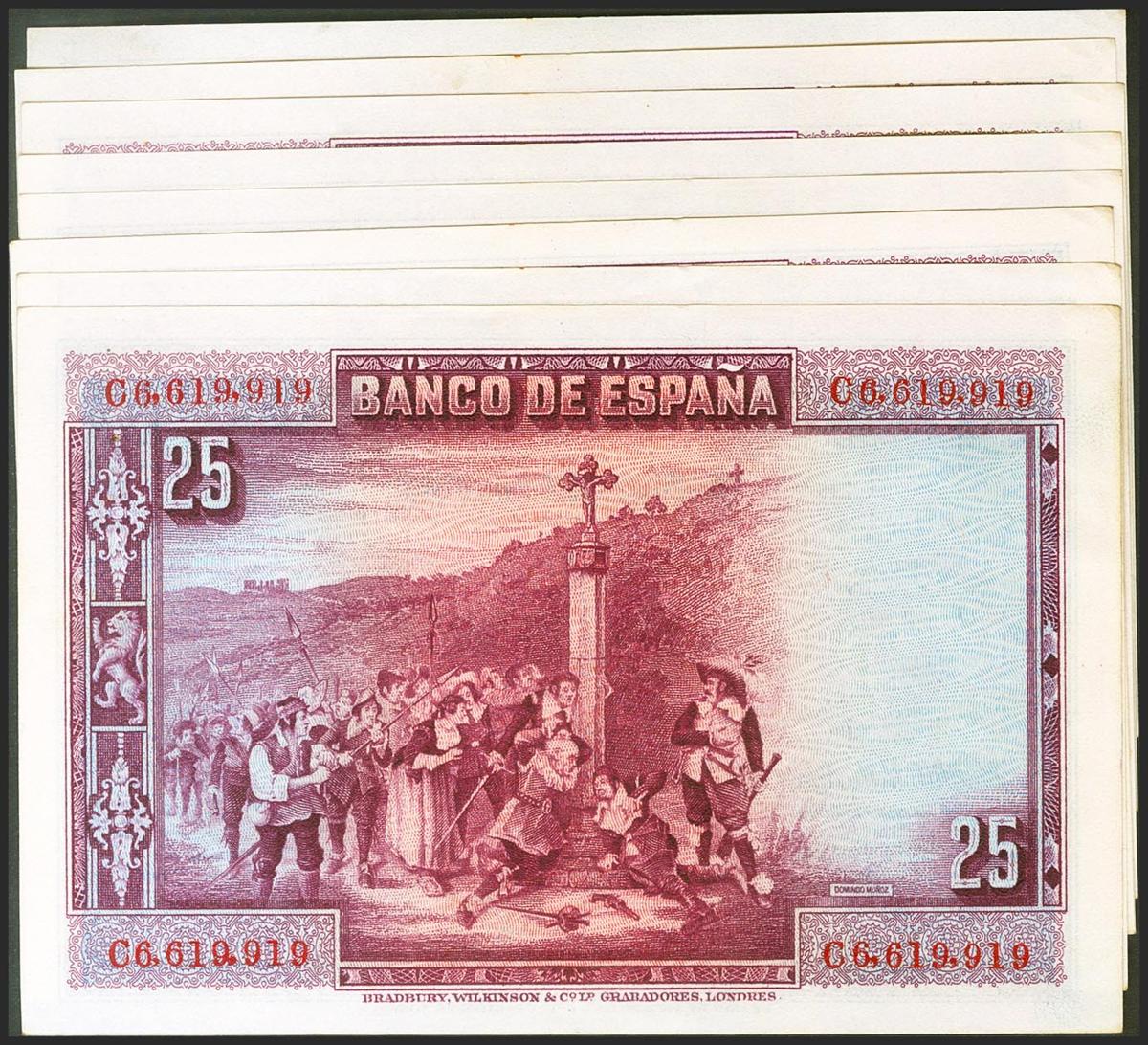 Precious set of 9 correlative banknotes of 25 Pesetas issued on August 15, 1928 with the C series (Edifil 2021: 353), preserving all its original size. Uncirculated/ Almost Uncirculated.