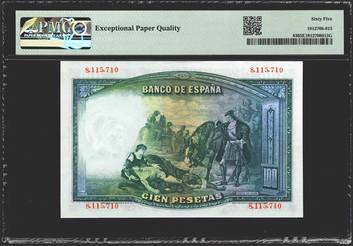 100 pesetas. April 25, 1931. No series. (Edifil 2021: 360, Pick: 83). original sizing Uncirculated. PMG65EPQ package.