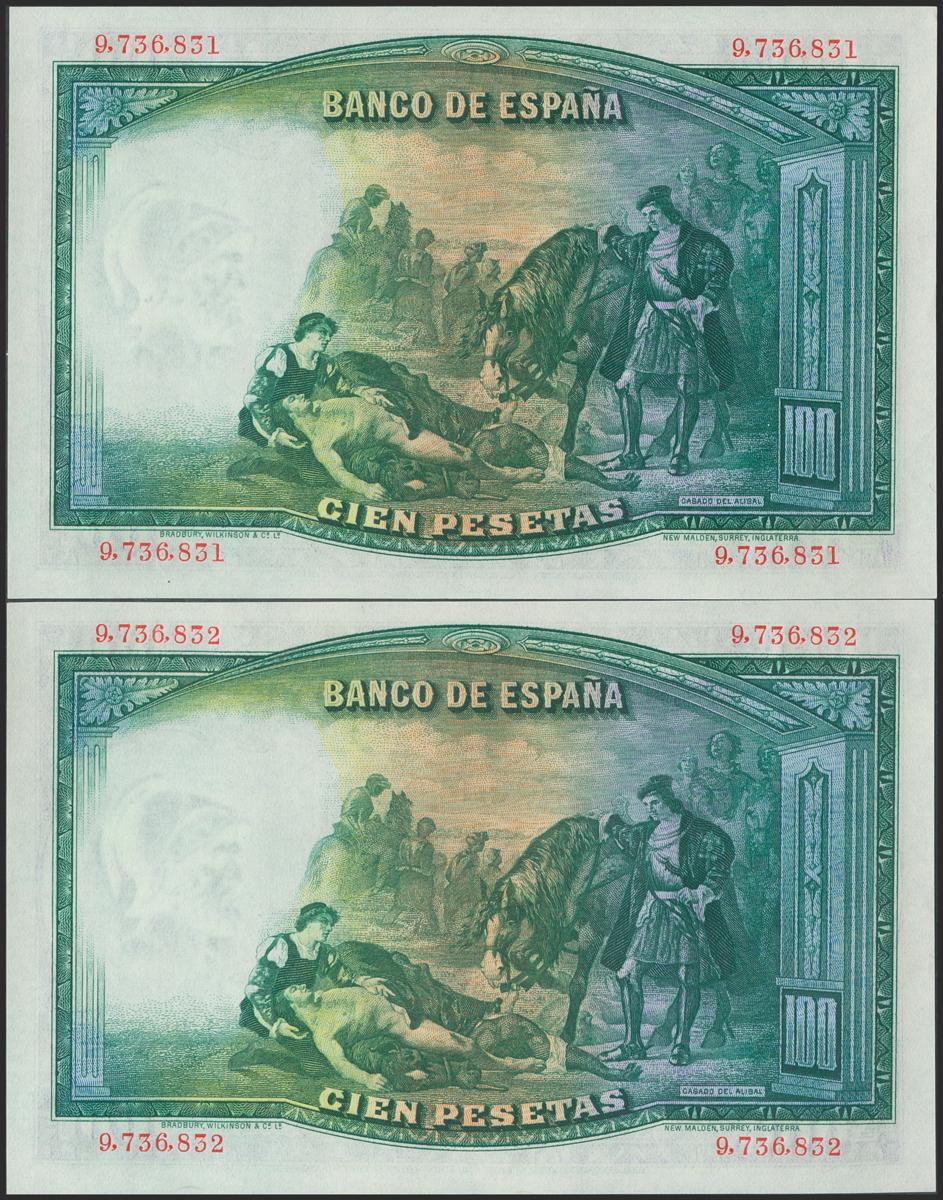 100 pesetas. April 25, 1931. Correlative couple. No serie. (Edifil 2017: 360). It retains all its original sizing. Uncirculated.