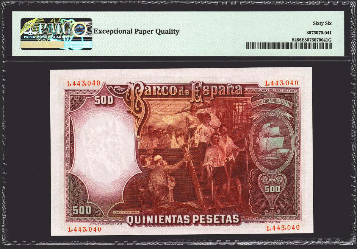 500 pesetas. April 25, 1931. No series. (Edifil 2021: 361, Pick: 84). Rare in this exceptional quality, original sizing. Uncirculated. PMG66EPQ package.