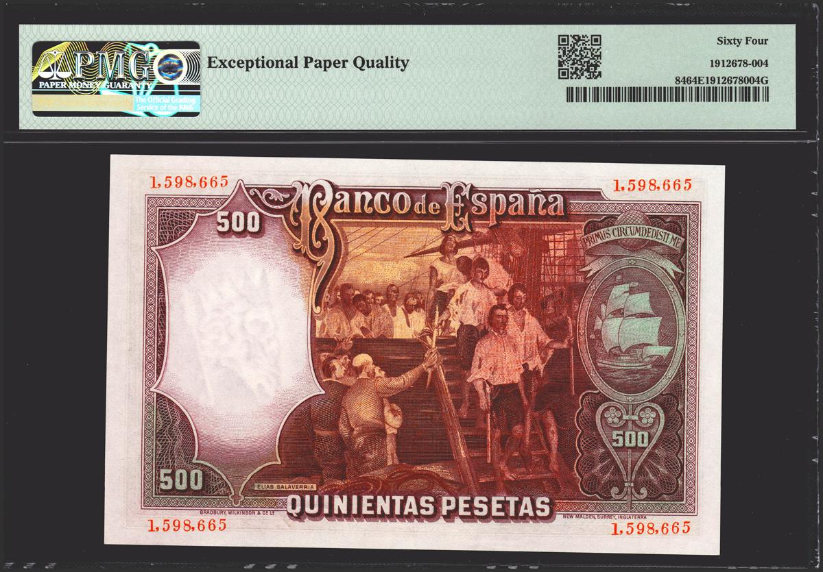 500 pesetas. April 25, 1931. No series. (Edifil 2021: 361, Pick: 84). Rare in this quality, original sizing. Uncirculated. PMG64EPQ package.