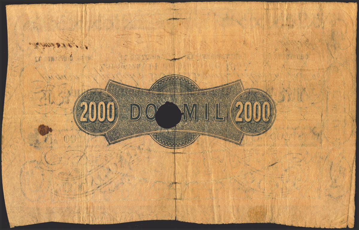2000 Reales. May 14, 1857. Bank of Zaragoza. Series E. With perforation, with signatures and very low numbering. (Edifil 2021: 130A). Rare. Good Very Fine.