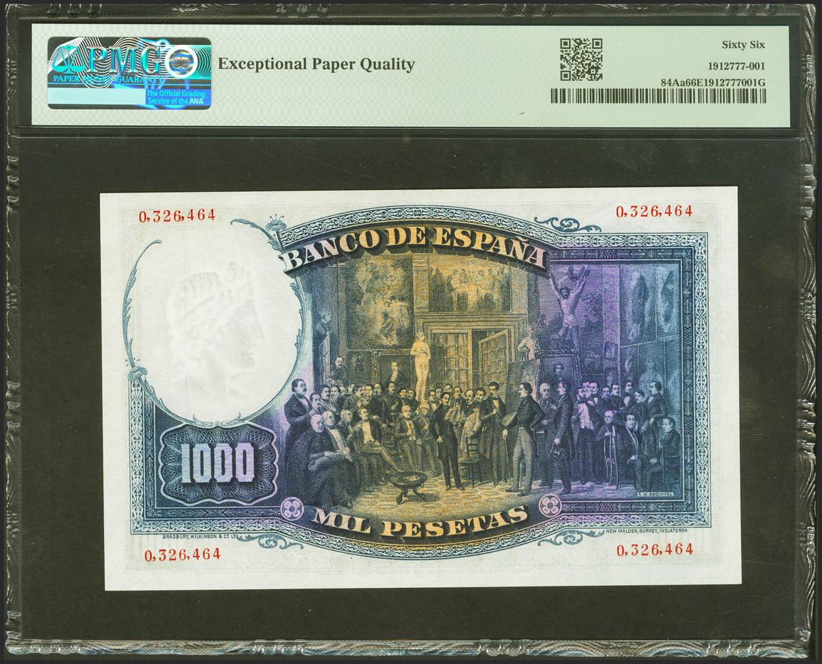 1000 pesetas. April 25, 1931. No series. (Edifil 2021: 362, Pick: 84Aa). Extraordinarily rare in this quality, original sizing. Uncirculated. PMG66EPQ package.