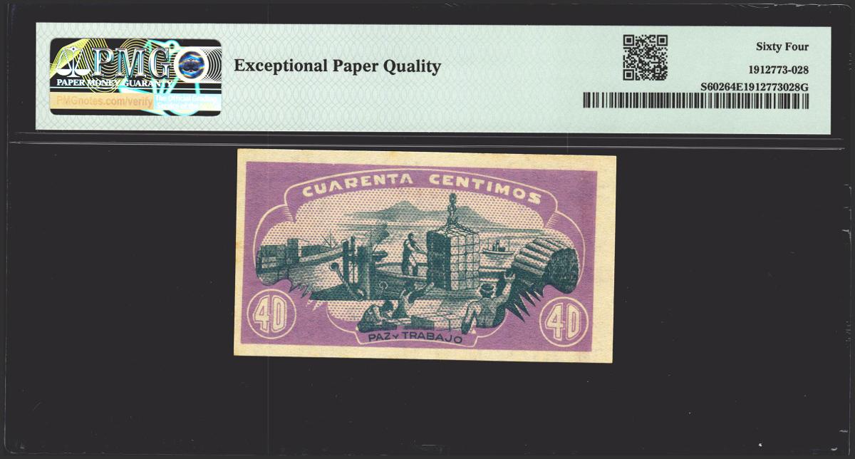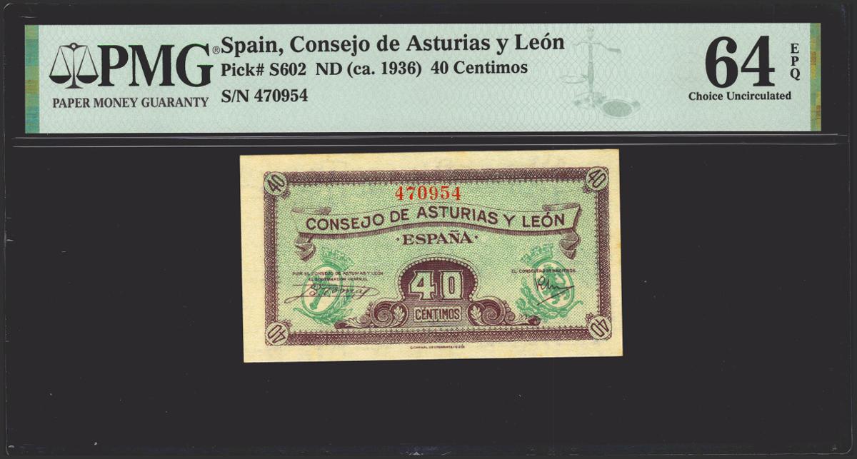 40 cents. 1937. Asturias and Leon. No serie. (Edifil 2021: 395, Pick: S602). Rare in this exceptional quality, original sizing. Uncirculated. PMG64EPQ package.
