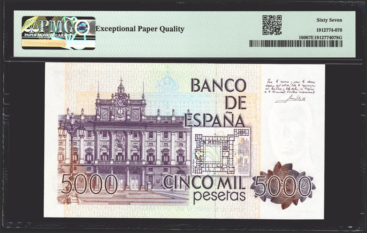 5000 pesetas. October 23, 1979. Without series and very low numbering (Nº000341). (Edifil 2021: 478, Pick: 160). Rare in this exceptional quality. Uncirculated. PMG67EPQ package.