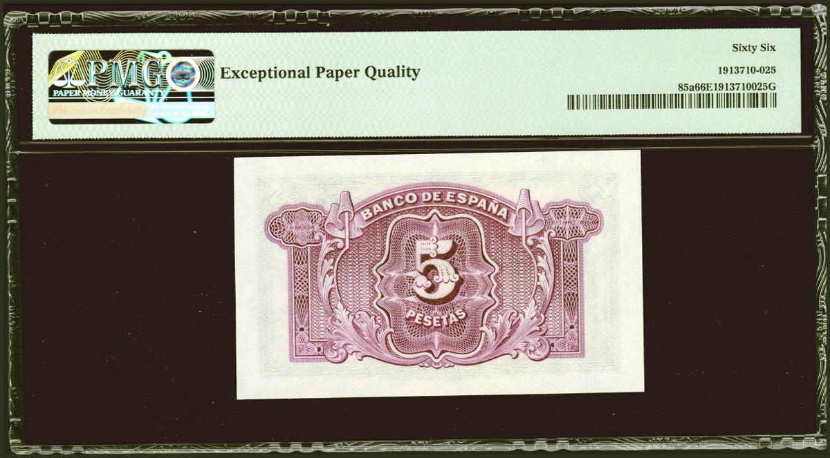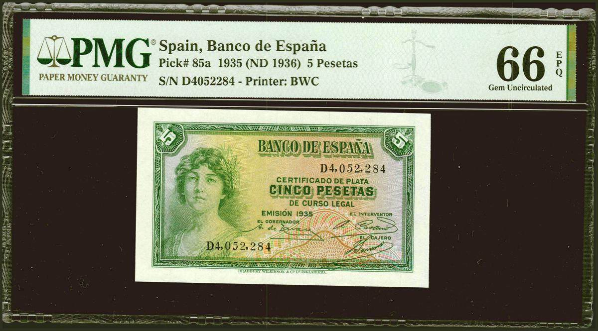 5 pesetas. 1935. Silver Certificate. Series D. (Edifil 2021: 363a, Pick: 85a). original sizing Uncirculated. PMG66EPQ package.