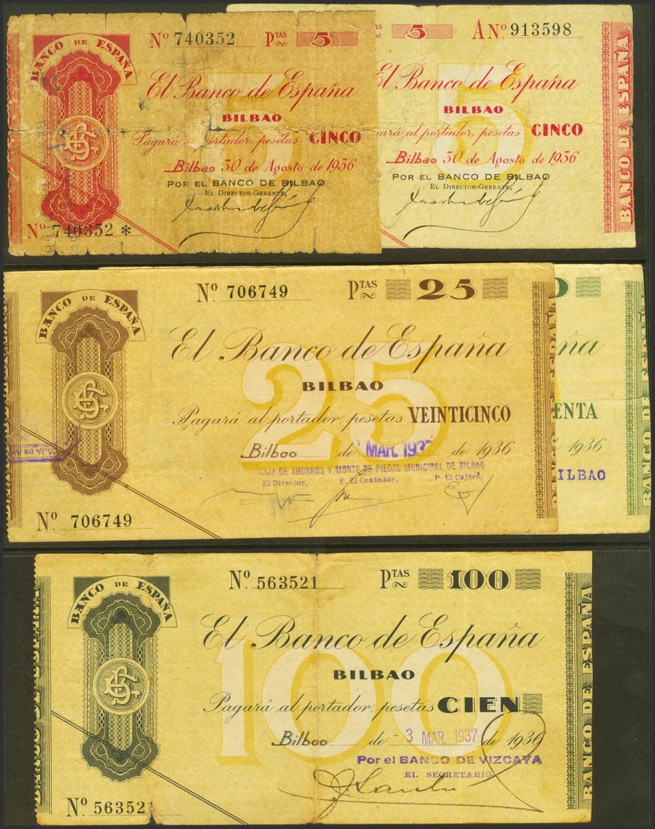 Complete series of 5 Banco de Bilbao banknotes, issued in 1936 including 5 Pesetas (without series and series A), 25 Pesetas, 50 Pesetas and 100 Pesetas. (Edifil 2021: 368/71). Good Fine/ Good Very Fine.
