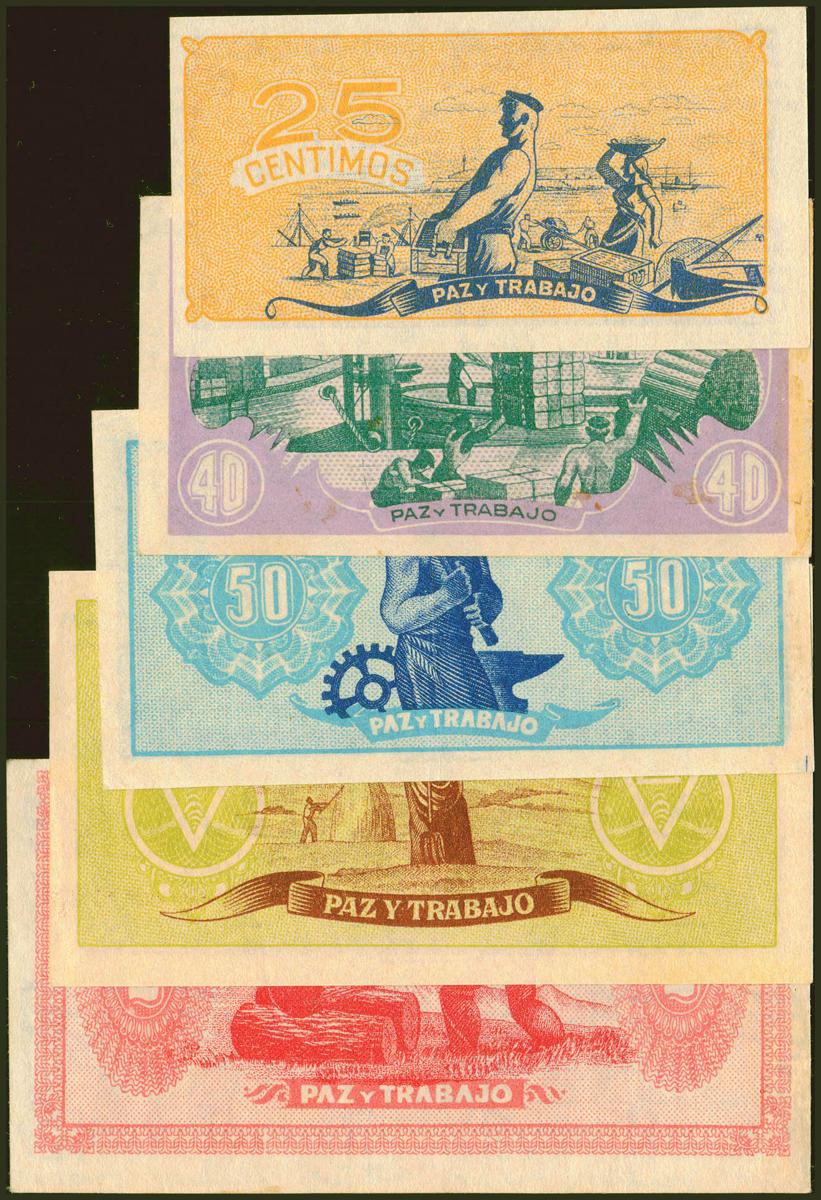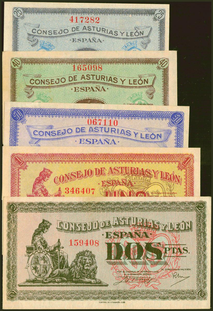 Complete series including 25 Cents, 40 Cents, 50 Cents, 1 Peseta and 2 Pesetas from 1937 from Asturias and León, all of them without series. (Edifil 2021: 394/98). Uncirculated/ Extremely Fine (the 50 cts Extremely Fine).