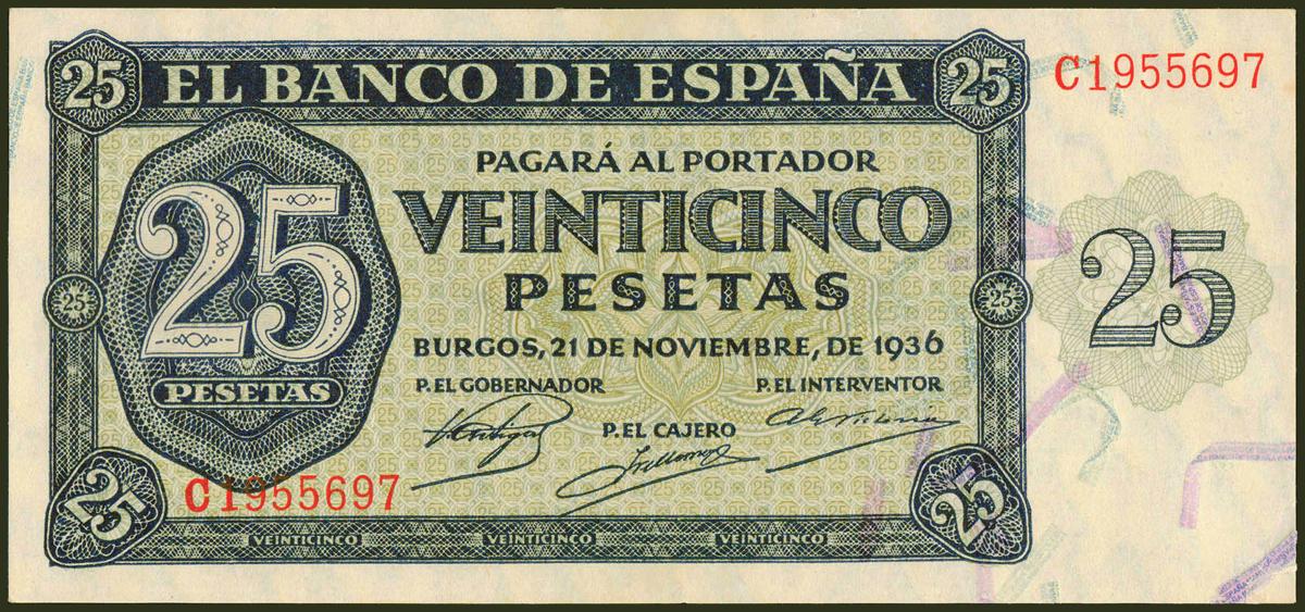 25 pesetas. November 21, 1936. Series C. (Edifil 2021: 419a). It retains much of its original sizing. Almost Uncirculated.