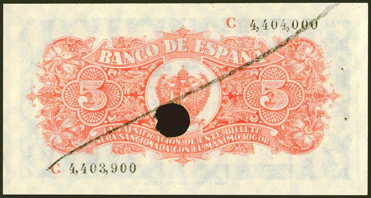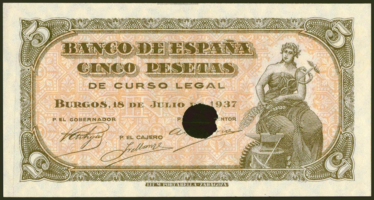 5 pesetas. June 18, 1937. Series C, last series issued, numbering error on the back that shows a jump in the hundreds digit. Drilled, with the usual staple dots and on the back canceled out in pencil. (Edifil 2021: 424a). Rare, original sizing. Extremely Fine.