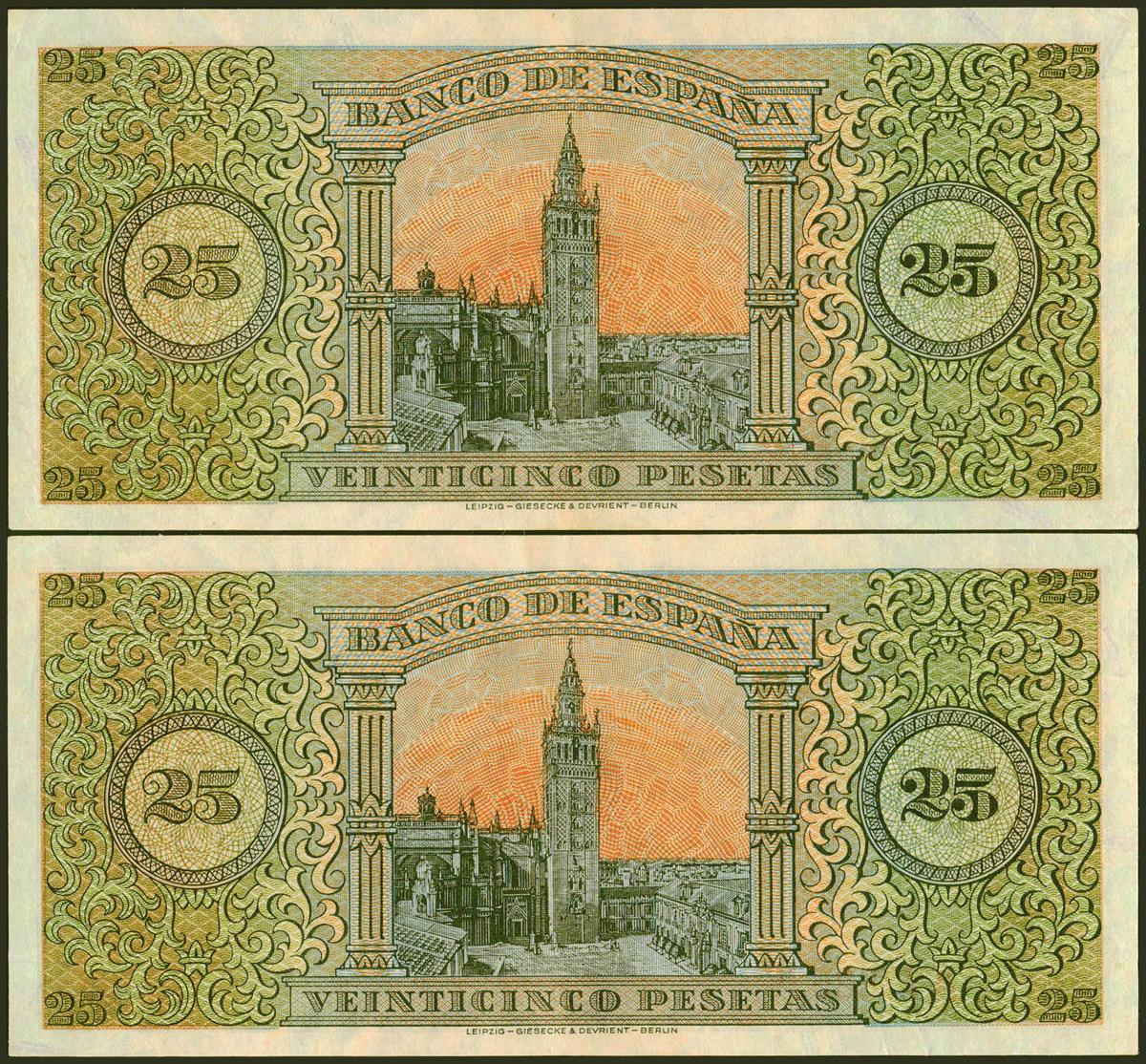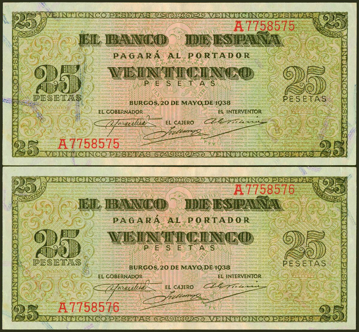 25 pesetas. May 20, 1938. Correlative couple. Series A. (Edifil 2021: 430). It retains part of its original size. Extremely Fine.