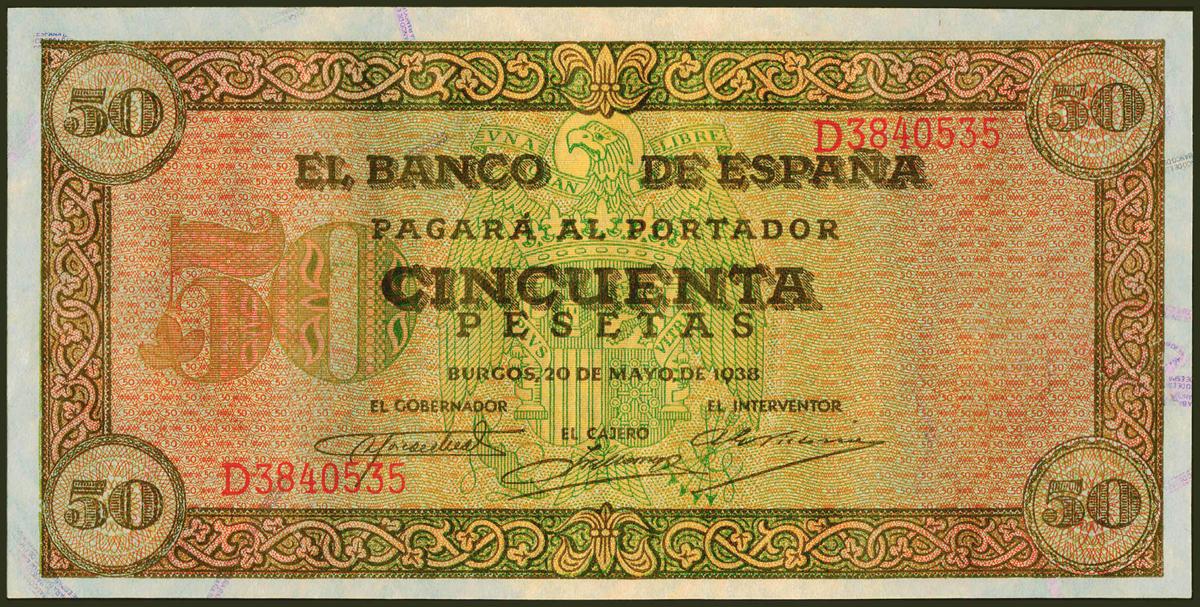50 pesetas. May 20, 1938. Series D. (Edifil 2021: 431a). Original sizing, natural wrinkles in the paper (this is the only reason to "remove" the Uncirculated). EBC+++.