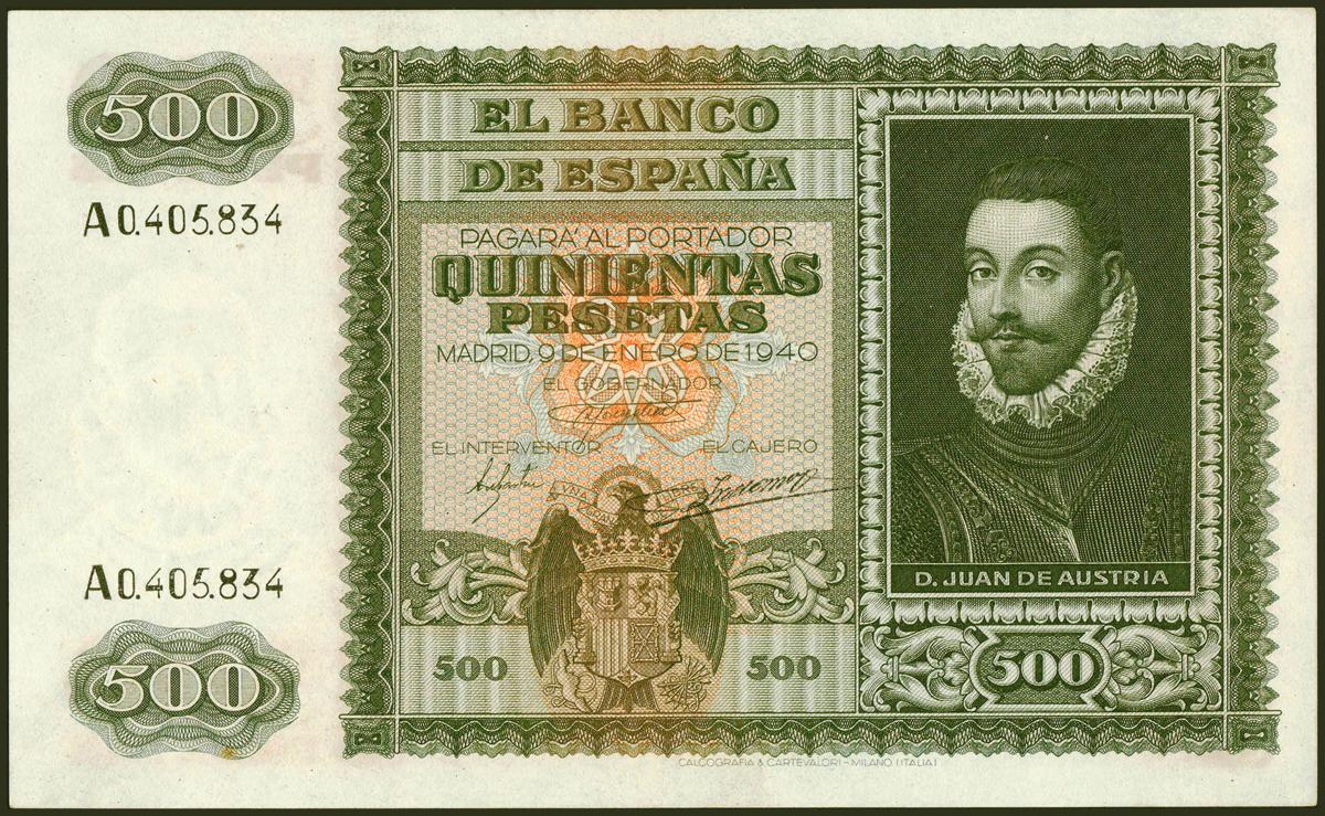 500 pesetas. January 9, 1940. Series A. (Edifil 2021: 439). It retains part of its original size. Extremely Fine.