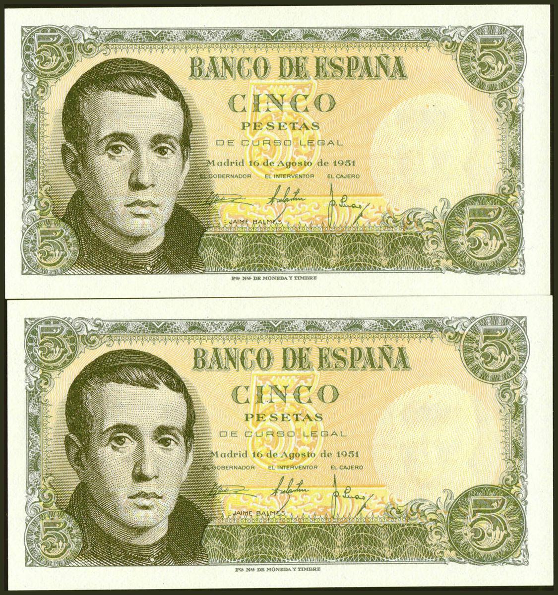 5 pesetas. August 16, 1951. Correlative couple. No serie. (Edifil 2021: 459). original sizing Uncirculated.