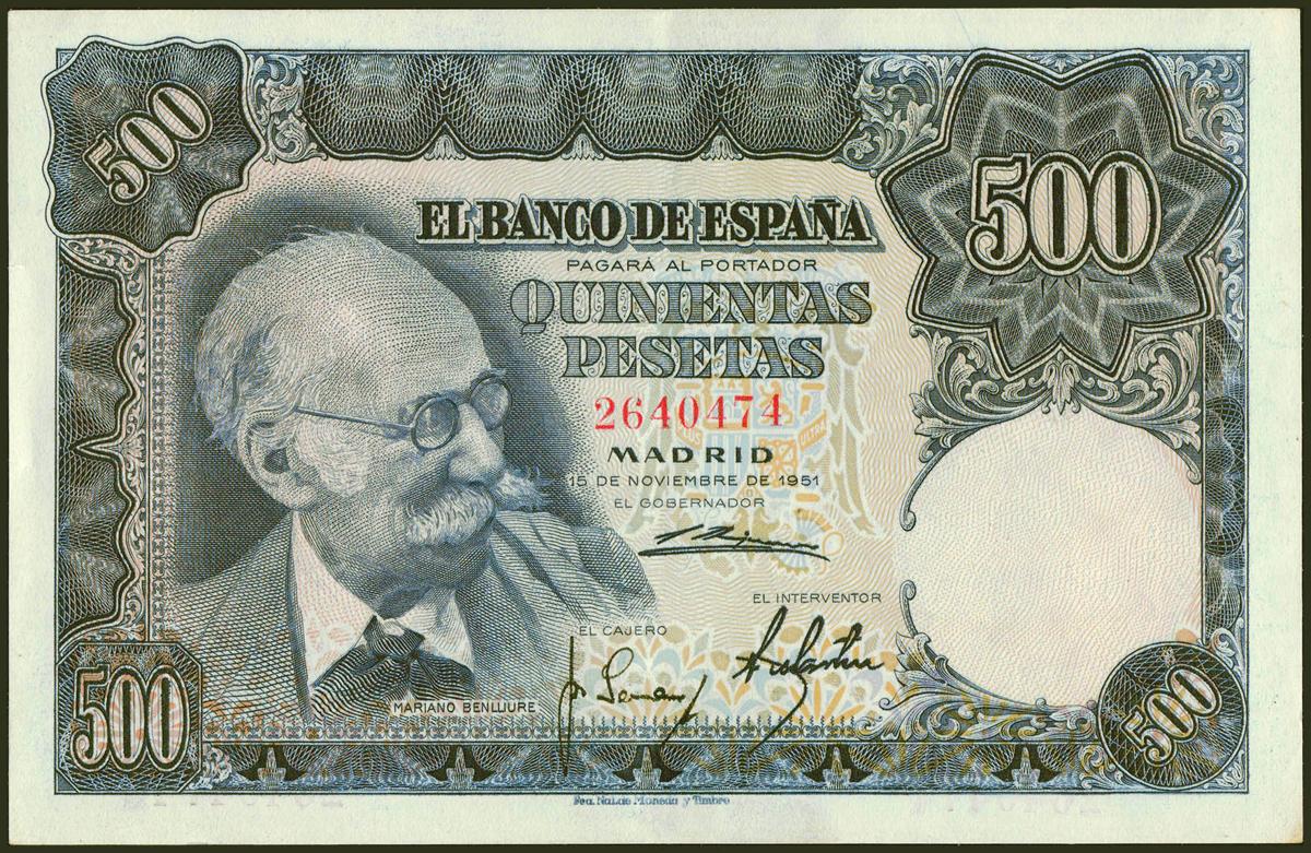 500 pesetas. November 15, 1951. No series. (Edifil 2021: 460). It retains all its original sizing. Good Extremely Fine.