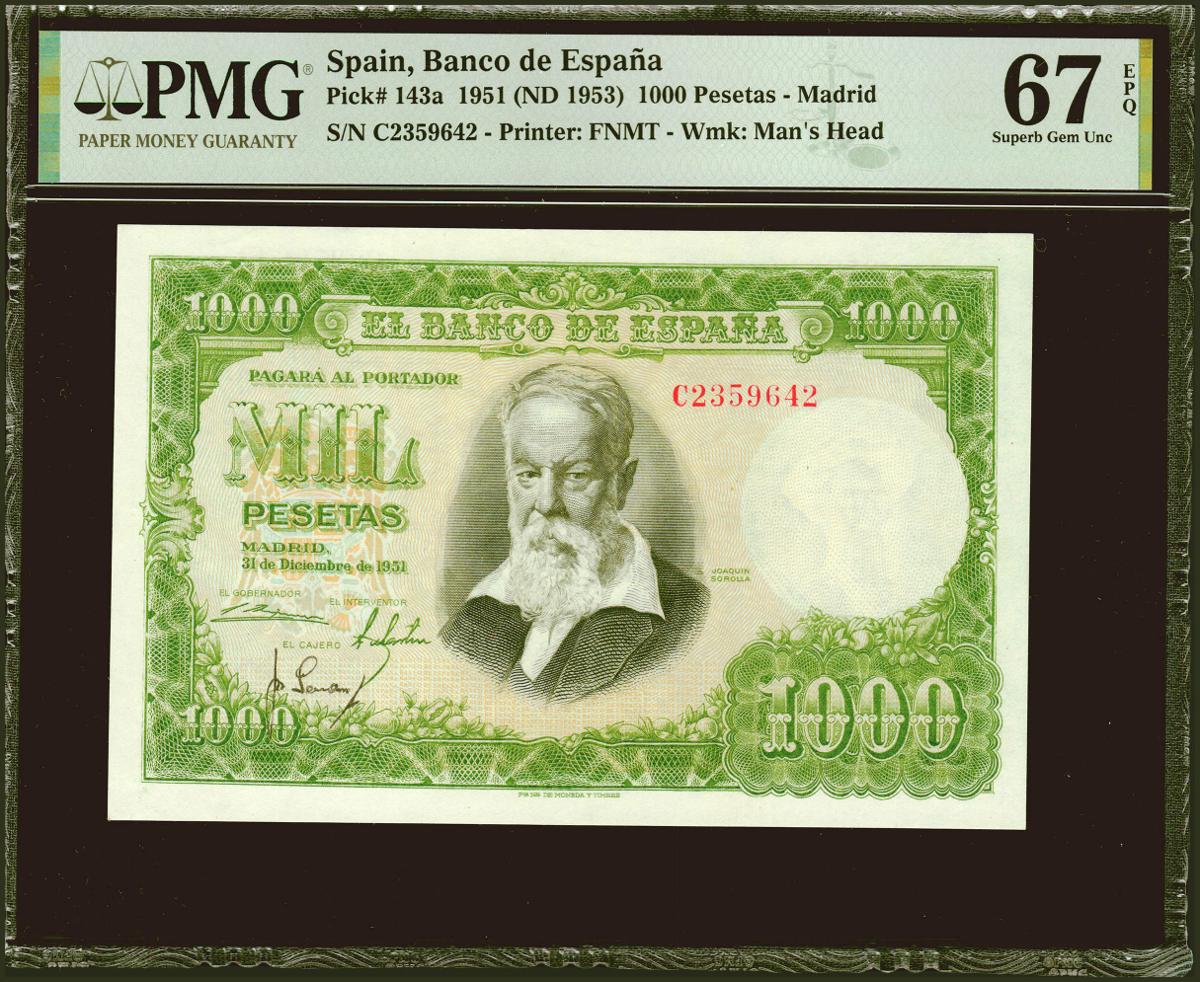 1000 pesetas. December 31, 1951. Series C. (Edifil 2021: 463a, Pick: 143a). Very rare in this exceptional quality, original sizing. Uncirculated. PMG67EPQ package.