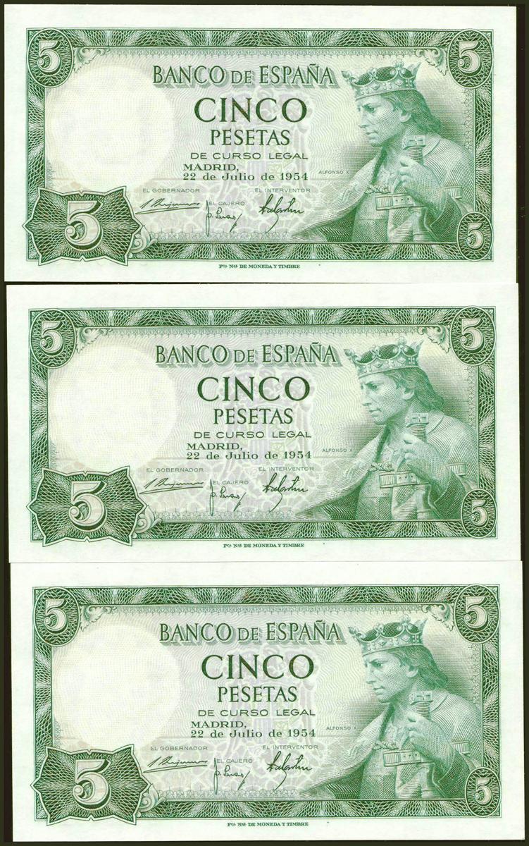 5 pesetas. July 22, 1954. Correlative trio. No serie. (Edifil 2021: 466). It retains all the original sizing. Uncirculated.