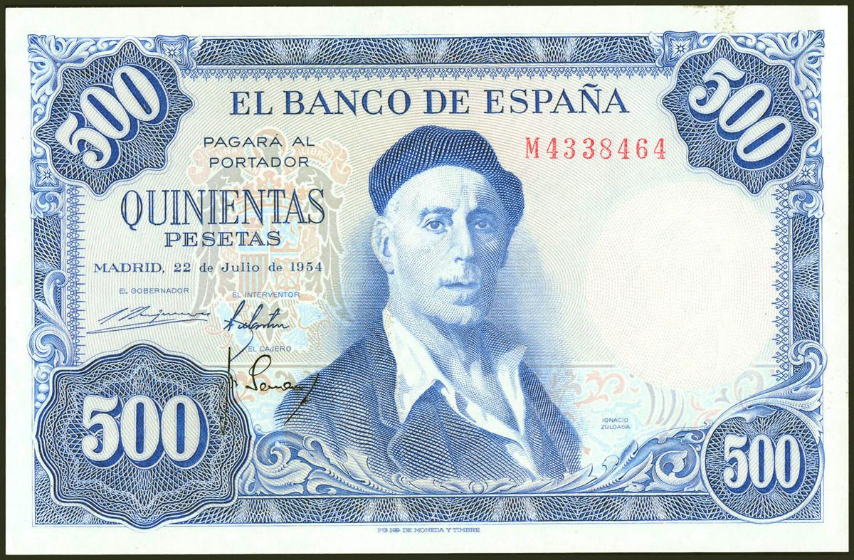 500 pesetas. July 22, 1954. Series M. (Edifil 2021: 468b). It retains all its original sizing. Almost Uncirculated.