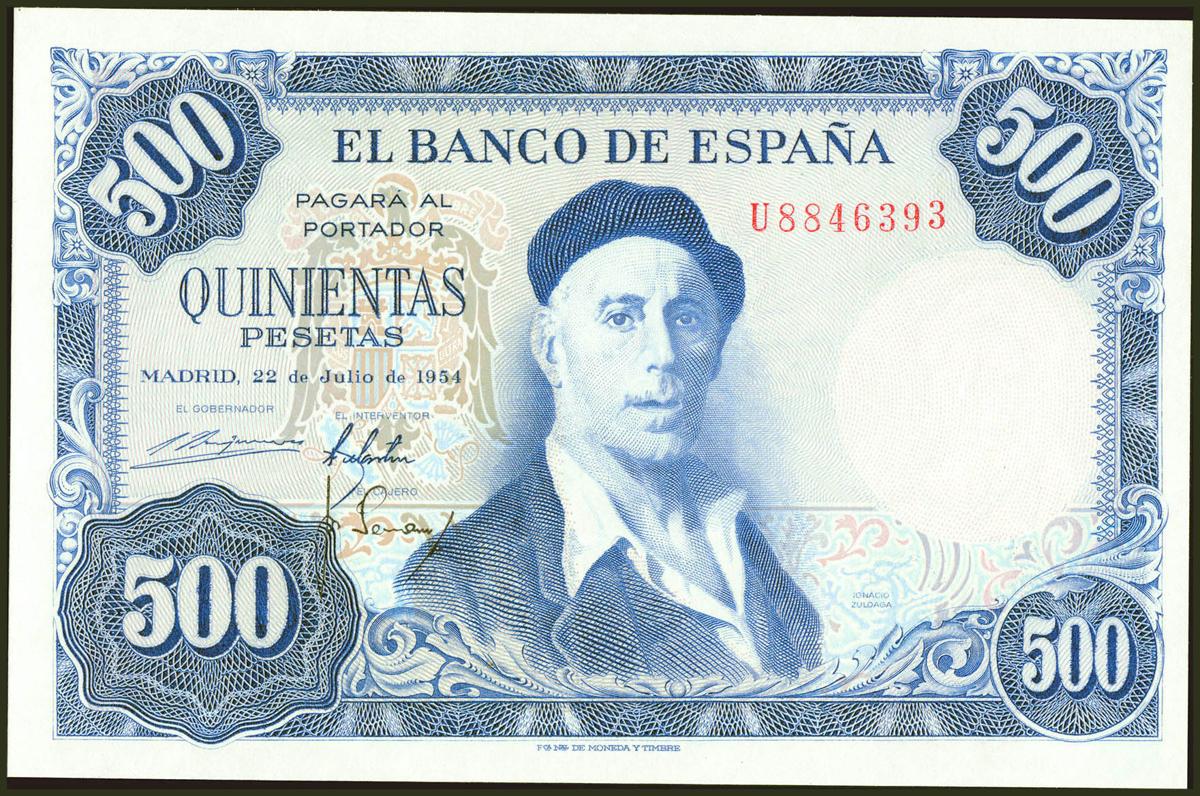 English 500 pesetas. July 22, 1954. Series U. (Edifil 2021: 468b). It retains all its original size and natural fold of the paper. Almost Uncirculated.